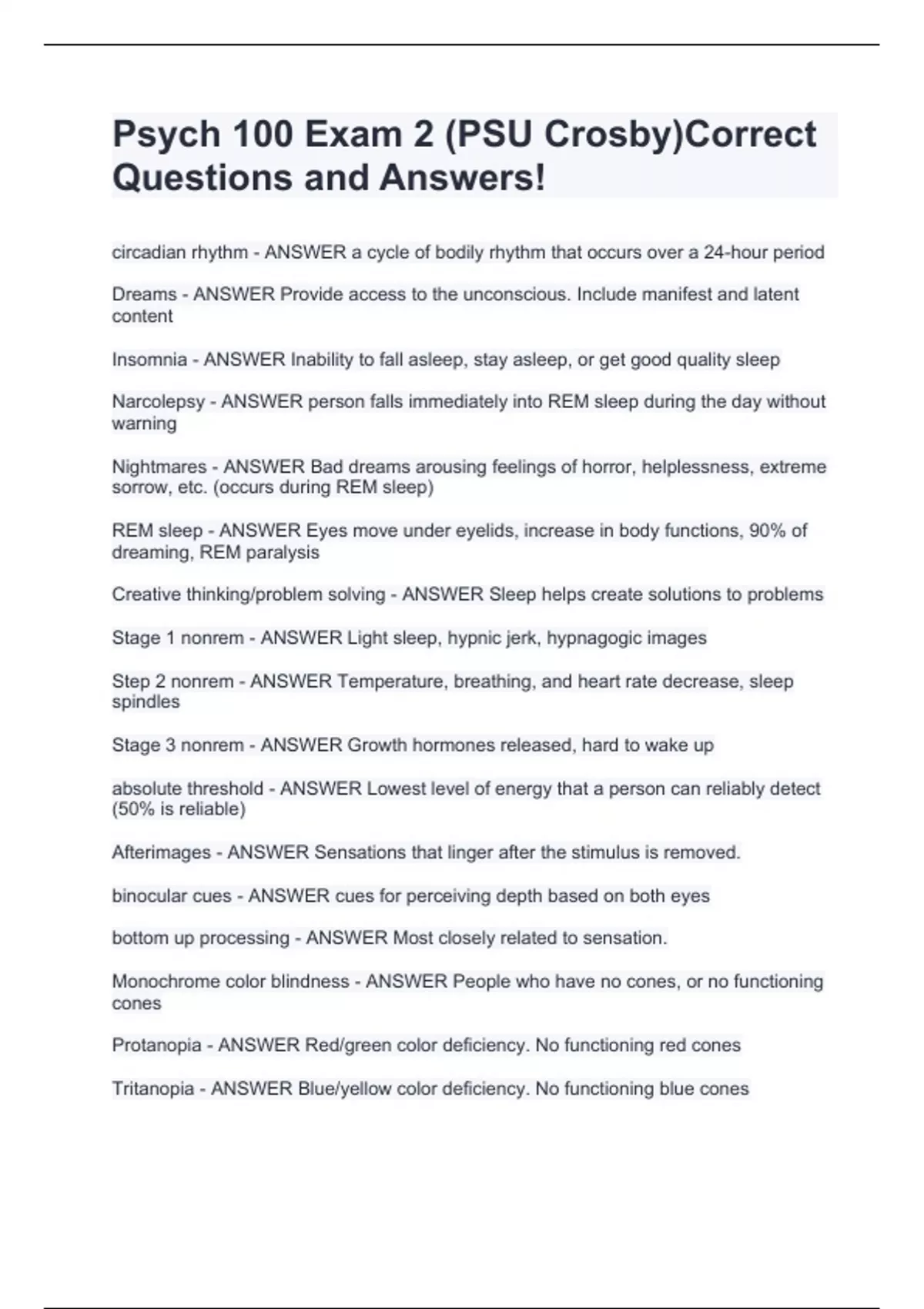 circadian rhythm - ANSWER a cycle of bodily rhythm that occurs over a 24-hour period Dreams - ANSWER Provide access to the unconscious. Include manifest and latent content Insomnia - ANSWER Inability to fall asleep, stay asleep, or get good quality sleep Narcolepsy - ANSWER person falls immediately into REM sleep during the day without warning Nightmares - ANSWER Bad dreams arousing feelings of horror, helplessness, extreme sorrow, etc. (occurs during REM sleep) REM sleep - ANSWER Eyes move under eyelids, increase in body functions, 90% of dreaming, REM paralysis Creative thinking/problem solving - ANSWER Sleep helps create solutions to problems Stage 1 nonrem - ANSWER Light sleep, hypnic jerk, hypnagogic images Step 2 nonrem - ANSWER Temperature, breathing, and heart rate decrease, sleep spindles Stage 3 nonrem - ANSWER Growth hormones released, hard to wake up absolute threshold - ANSWER Lowest level of energy that a person can reliably detect (50% is reliable)