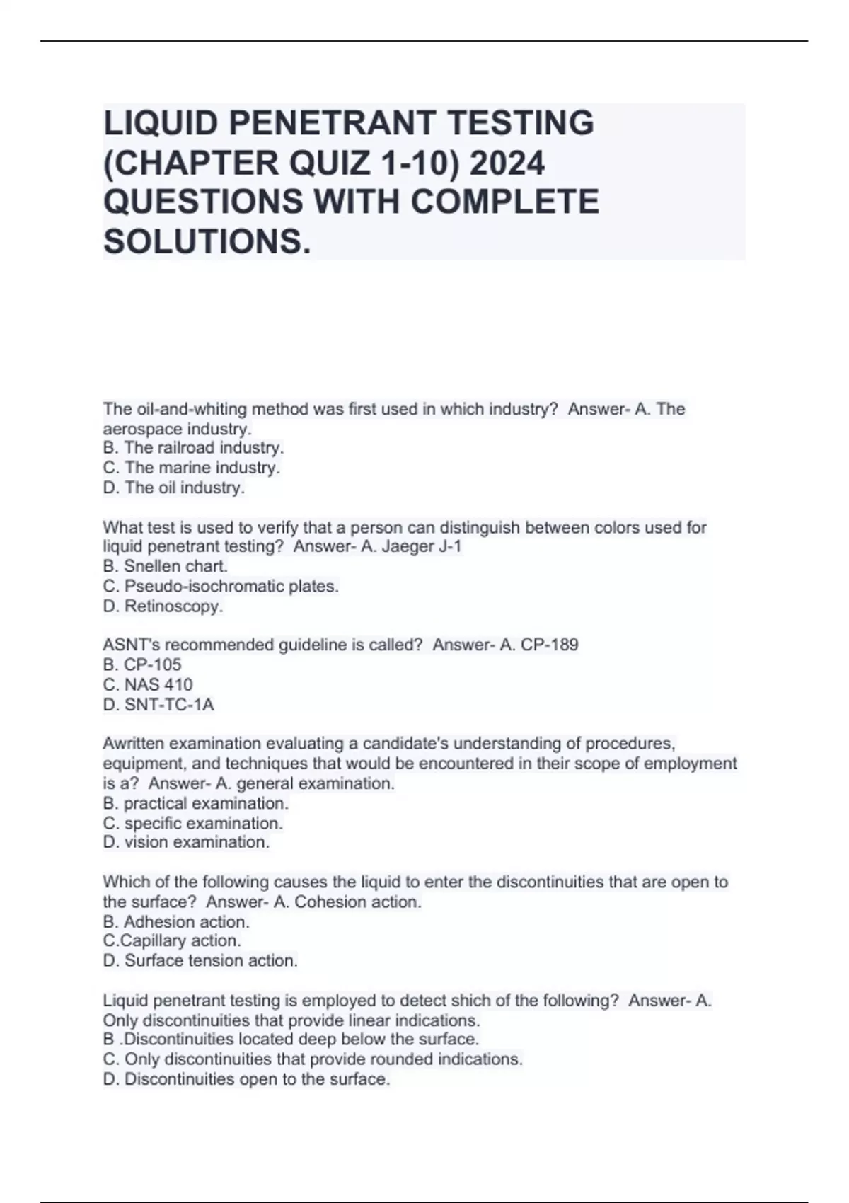 LIQUID PENETRANT TESTING (CHAPTER QUIZ 1-10) 2024 QUESTIONS WITH COMPLETE SOLUTIONS.