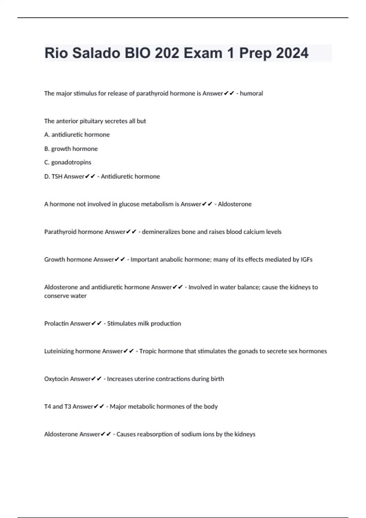 The major stimulus for release of parathyroid hormone is Answer - humoral The anterior pituitary secretes all but A. antidiuretic hormone B. growth hormone C. gonadotropins D. TSH Answer - Antidiuretic hormone A hormone not involved in glucose metabolism is Answer - Aldosterone Parathyroid hormone Answer - demineralizes bone and raises blood calcium levels Growth hormone Answer - Important anabolic hormone; many of its effects mediated by IGFs Aldosterone and antidiuretic hormone Answer - Involved in water balance; cause the kidneys to conserve water Prolactin Answer - Stimulates milk production Luteinizing hormone Answer - Tropic hormone that stimulates the gonads to secrete sex hormones Oxytocin Answer - Increases uterine contractions during birth T4 and T3 Answer - Major metabolic hormones of the body