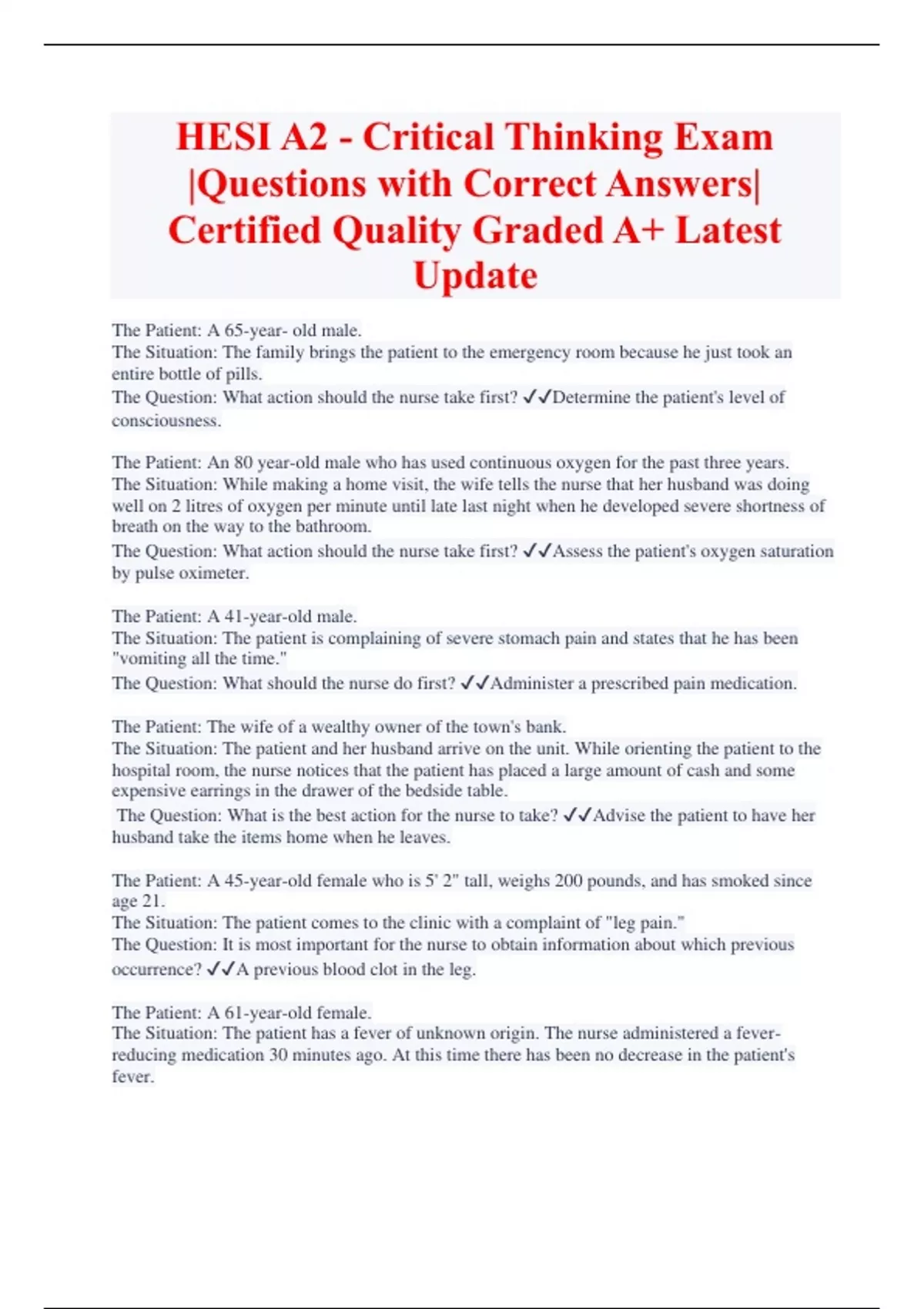 HESI A2 - Critical Thinking Exam |Questions with Correct Answers| Certified Quality Graded A+ Latest Update The Patient: A 65-year- old male. The Situation: The family brings the patient to the emergency room because he just took an entire bottle of pills. The Question: What action should the nurse take first? Determine the patient's level of consciousness. The Patient: An 80 year-old male who has used continuous oxygen for the past three years. The Situation: While making a home visit, the wife tells the nurse that her husband was doing well on 2 litres of oxygen per minute until late last night when he developed severe shortness of breath on the way to the bathroom. The Question: What action should the nurse take first? Assess the patient's oxygen saturation by pulse oximeter. The Patient: A 41-year-old male. The Situation: The patient is complaining of severe stomach pain and states that he has been "vomiting all the time." The Question: What should the nurse do first? Administer a prescribed pain medication. The Patient: The wife of a wealthy owner of the town's bank. The Situation: The patient and her husband arrive on the unit. While orienting the patient to the hospital room, the nurse notices that the patient has placed a large amount of cash and some expensive earrings in the drawer of the bedside table. The Question: What is the best action for the nurse to take? Advise the patient to have her husband take the items home when he leaves.
