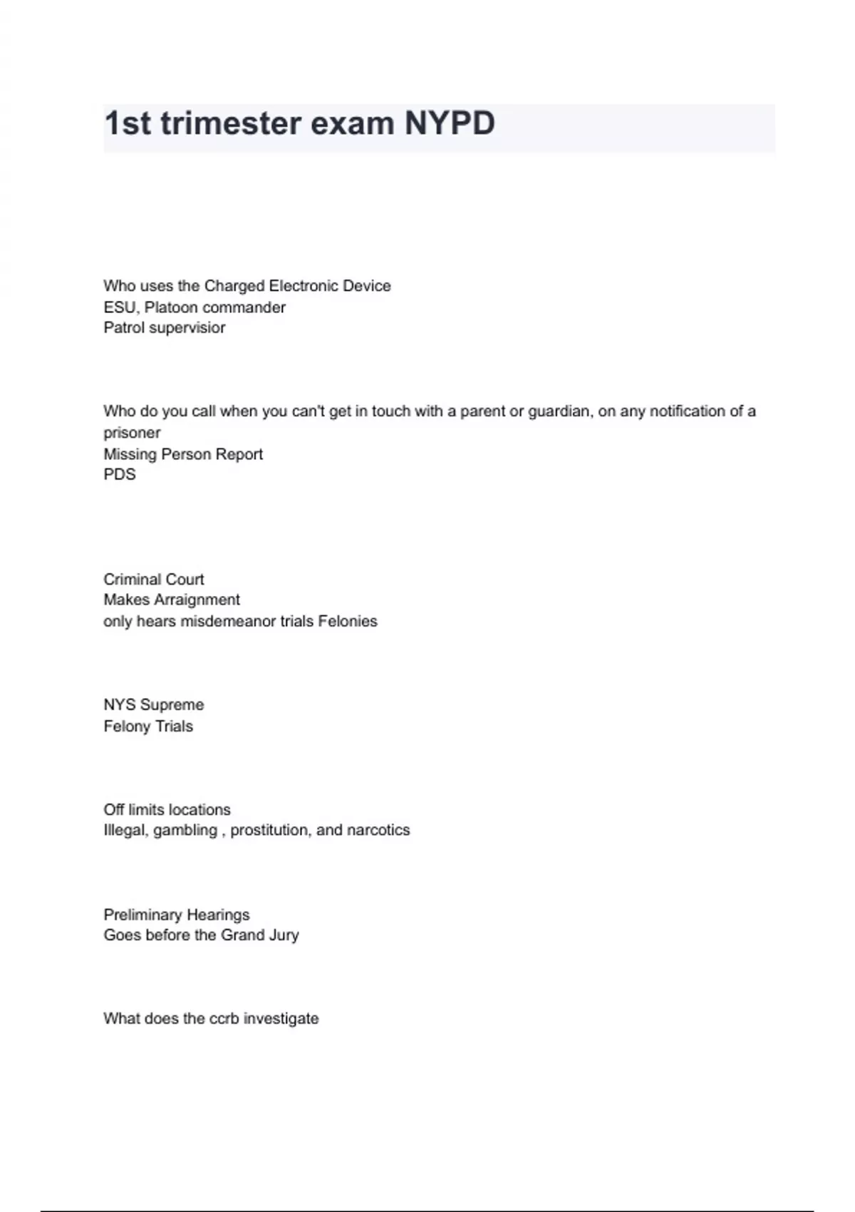 Who uses the Charged Electronic Device ESU, Platoon commander Patrol supervisior Who do you call when you can't get in touch with a parent or guardian, on any notification of a prisoner Missing Person Report PDS Criminal Court Makes Arraignment only hears misdemeanor trials Felonies NYS Supreme Felony Trials Off limits locations Illegal, gambling , prostitution, and na