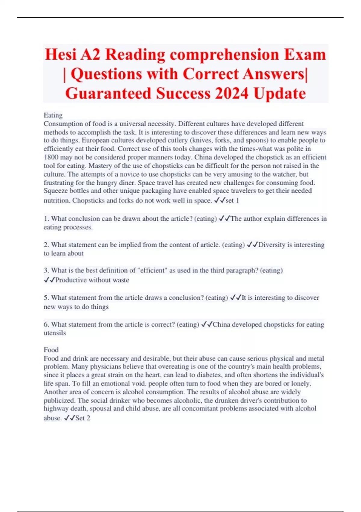 Hesi A2 Reading comprehension Exam | Questions with Correct Answers| Guaranteed Success 2024 Update Eating Consumption of food is a universal necessity. Different cultures have developed different methods to accomplish the task. It is interesting to discover these differences and learn new ways to do things. European cultures developed cutlery (knives, forks, and spoons) to enable people to efficiently eat their food. Correct use of this tools changes with the times-what was polite in 1800 may not be considered proper manners today. China developed the chopstick as an efficient tool for eating. Mastery of the use of chopsticks can be difficult for the person not raised in the culture. The attempts of a novice to use chopsticks can be very amusing to the watcher, but frustrating for the hungry diner. Space travel has created new challenges for consuming food. Squeeze bottles and other unique packaging have enabled space travelers to get their needed nutrition. Chopsticks and forks do not work well in space. set 1 1. What conclusion can be drawn about the article? (eating) The author explain differences in eating processes. 2. What statement can be implied from the content of article. (eating) Diversity is interesting to learn about 3. What is the best definition of "efficient" as used in the third paragraph? (eating) Productive without waste 5. What statement from the article draws a conclusion? (eating) It is interesting to discover new ways to do things 6. What statement from the article is correct? (eating) China developed chopsticks for eating utensils Food Food and drink are necessary and desirable, but their abuse can cause serious physical and metal problem. Many physicians believe that overeating is one of the country's main health problems, since it places a great strain on the heart, can lead to diabetes, and often shortens the individual's life span. To fill an emotional void. people often turn to food when they are bored or lonely. Another area of concern is alcohol consumption. The results of alcohol abuse are widely publicized. The social drinker who becomes alcoholic, the drunken driver's contribution to highway death, spousal and child abuse, are all concomitant problems associated with alcohol abuse. Set 2
