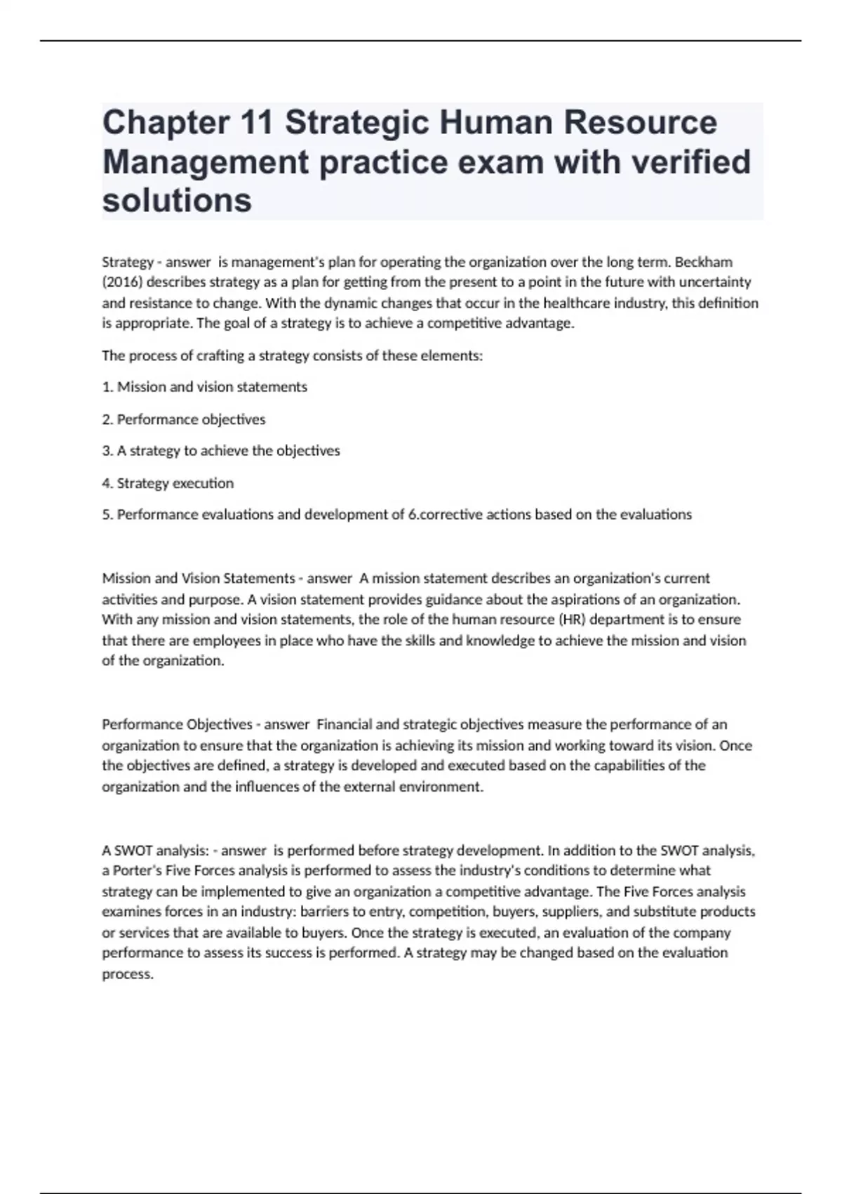 Chapter 11 Strategic Human Resource Management practice exam with verified solutions