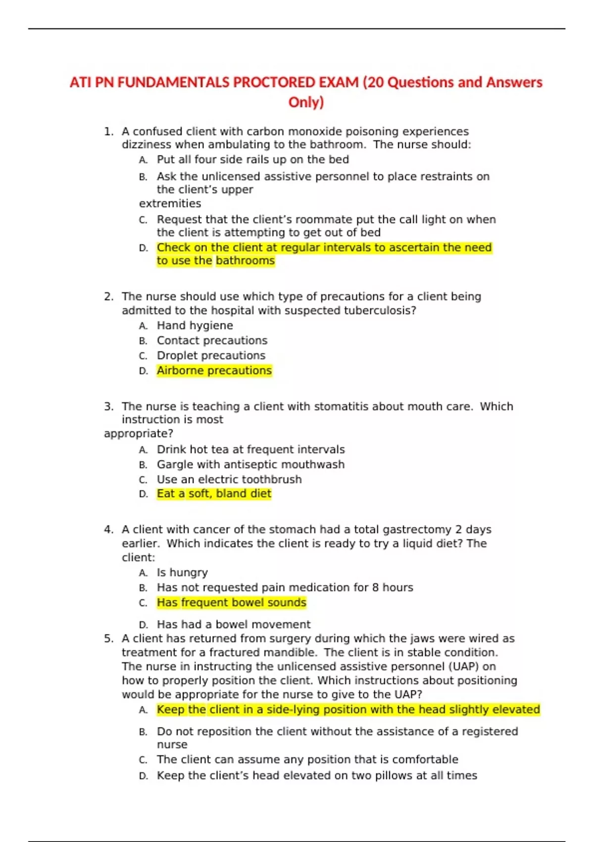 ATI PN FUNDAMENTALS PROCTORED EXAM (20 Questions and Answers Only)