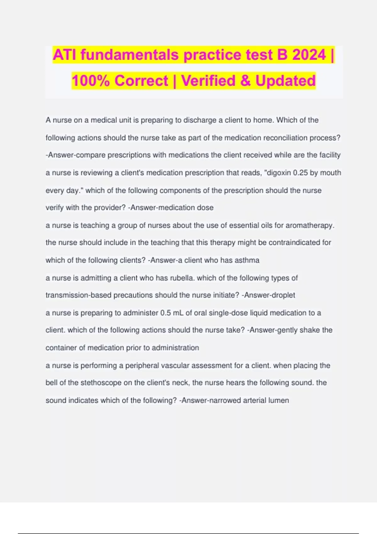 ATI fundamentals practice test B 2024 | 100% Correct | Verified & Updated A nurse on a medical unit is preparing to discharge a client to home. Which of the following actions should the nurse take as part of the medication reconciliation process? -Answer-compare prescriptions with medications the client received while are the facility a nurse is reviewing a client's medication prescription that reads, "digoxin 0.25 by mouth every day." which of the following components of the prescription should the nurse verify with the provider? -Answer-medication dose a nurse is teaching a group of nurses about the use of essential oils for aromatherapy. the nurse should include in the teaching that this therapy might be contraindicated for which of the following clients? -Answer-a client who has asthma a nurse is admitting a client who has rubella. which of the following types of transmission-based precautions should the nurse initiate? -Answer-droplet a nurse is preparing to administer 0.5 mL of oral single-dose liquid medication to a client. which of the following actions should the nurse take? -Answer-gently shake the container of medication prior to administration a nurse is performing a peripheral vascular assessment for a client. when placing the bell of the stethoscope on the client's neck, the nurse hears the following sound. the sound indicates which of the following? -Answer-narrowed arterial lumen a nurse is caring for a client who is refusing a blood transfusion for religious reasons. the client's partner wants the client to have the blood transfusion. which of the following actions should the nurse take? -Answer-withhold the blood transfusion a nurse in an acute care facility is preparing a discharge summary for a client who is transferring to a long-term care facility. which of the following documentation should the nurse include? -Answer-current medications a nurse is assessing an adult client who has been immobile for the past 3 weeks. for which of the following findings should the nurse intervene? -Answer-erythema on pressure points a nurse is planning on teaching for a group of adolescents who each recently had surgical placement of an ostomy. which of the following methods should the nurse use as a pyschomotor approach to learning? -Answer-practice sessions a nurse is caring for a client who reports pain. when documenting the quality of the client's pain on an initial pain assessment, the nurse should record which of the following client statements? -Answer-the pain is like a dull ache in my stomach a nurse is reviewing practice guidelines with a group of newly licensed nurses. which of the following interventions should the nurse include that is within the RN scope of practice? -Answer-initiate an enteral feeding through a gastrostomy tube A client who is nonambulatory notifies the nurse that his trash can is on fire. After the nurse confirms the fire, which of the following actions should the nurse take next? - Answer-evacuate the client a nurse is discussing the use of herbal supplements for health promotion with a client. which of the following client statements indicates an understanding of herbal supplement use? -Answer-i can take echinacea to improve my immune system a nurse enters a client's room and finds her on the floor. the client's roommate reports that the client was trying to get out of bed and fell over the side rail onto the floor. which of the following statements should the nurse document about this incident? -Answer- client found lying on floor a nurse is performing a Romberg test during the physical assessment of a client. which of the following techniques should the nurse use? -Answer-have the client stand with their arms at their sides and their feet together a nurse is teaching a client whose left leg is in a cast about using crutches. which of the following statements should the nurse identify as an indication that the client understands the teaching? -Answer-when descending the stairs, i will first shift my weight to my right leg a nurse is preparing to administer multiple medications to a client who has an enteral feeding tube. which of the following actions should the nurse plan to take? -Answer- flush the tube with 15 mL of sterile water a community health nurse is checking blood pressures for a group of clients at a community health screening. which of the following clients is at an increased risk for hypertension? -Answer-a client who smokes one pack of cigarettes each day a nurse is planning care for a client who has vision loss. which of the following interventions should the nurse include in the plan of care to assist the client with feeding? -Answer-arrange food in a consistent pattern on the client'