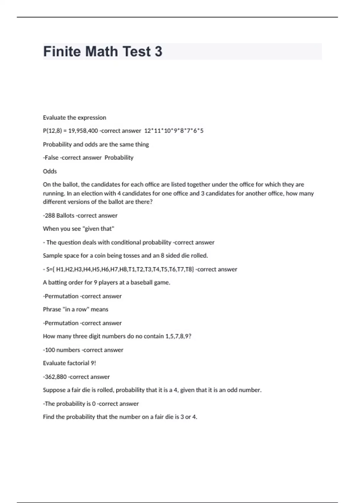 Finite Math Test 3 Evaluate the expression P(12,8) = 19,958,400 -correct answer 12*11*10*9*8*7*6*5 Probability and odds are the same thing -False -correct answer Probability Odds On the ballot, the candidates for each office are listed together under the office for which they are running. In an election with 4 candidates for one office and 3 candidates for another office, how many different versions of the ballot are there? -288 Ballots -correct answer When you see "given that" - The question deals with conditional probability -correct answer Sample space for a coin being tosses and an 8 sided die rolled. - S={ H1,H2,H3,H4,H5,H6,H7,H8,T1,T2,T3,T4,T5,T6,T7,T8} -correct answer A batting order for 9 players at a baseball game. -Permutation -correct answer Phrase "in a row" means -Permutation -correct answer How many three digit numbers do no contain 1,5,7,8,9? -100 numbers -correct answer Evaluate factorial 9! -362,880 -correct answer Suppose a fair die is rolled, probability that it is a 4, given that it is an odd number. -The probability is 0 -correct answer Find the probability that the number on a fair die is 3 or 4.