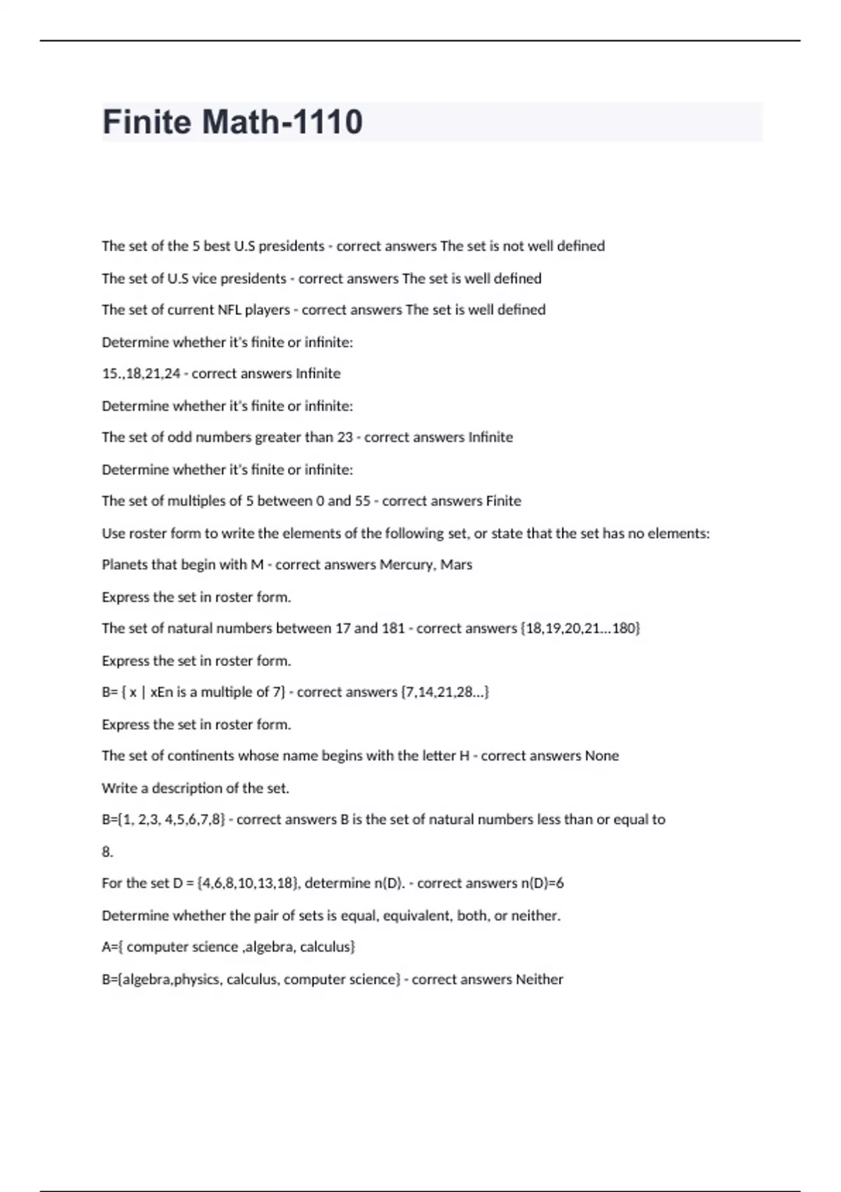 Finite Math-1110 The set of the 5 best U.S presidents - correct answers The set is not well defined The set of U.S vice presidents - correct answers The set is well defined The set of current NFL players - correct answers The set is well defined Determine whether it's finite or infinite: 15.,18,21,24 - correct answers Infinite Determine whether it's finite or infinite: The set of odd numbers greater than 23 - correct answers Infinite Determine whether it's finite or infinite: The set of multiples of 5 between 0 and 55 - correct answers Finite Use roster form to write the elements of the following set, or state that the set has no elements: Planets that begin with M - correct answers Mercury, Mars Express the set in roster form. The set of natural numbers between 17 and 181 - correct answers {18,19,20,21...180} Express the set in roster form. B= { x | xEn is a multiple of 7} - correct answers {7,14,21,28...} Express the set in roster form. The set of continents whose name begins with the letter H - correct answers None Write a description of the set. B={1, 2,3, 4,5,6,7,8} - correct answers B is the set of natural numbers less than or equal to 8. For the set D = {4,6,8,10,13,18}, determine n(D). - correct answers n(D)=6 Determine whether the pair of sets is equal, equivalent, both, or neither. A={ computer science ,algebra, calculus} B={algebra,physics, calculus, computer science} - correct answers Neither