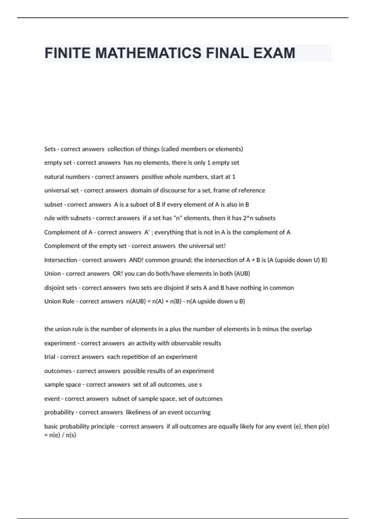 FINITE MATHEMATICS FINAL EXAM Sets - correct answers collection of things (called members or elements) empty set - correct answers has no elements, there is only 1 empty set natural numbers - correct answers positive whole numbers, start at 1 universal set - correct answers domain of discourse for a set, frame of reference subset - correct answers A is a subset of B if every element of A is also in B rule with subsets - correct answers if a set has "n" elements, then it has 2^n subsets Complement of A - correct answers A' ; everything that is not in A is the complement of A Complement of the empty set - correct answers the universal set! Intersection - correct answers AND! common ground; the intersection of A + B is (A (upside down U) B) Union - correct answers OR! you can do both/have elements in both (AUB) disjoint sets - correct answers two sets are disjoint if sets A and B have nothing in common Union Rule - correct answers n(AUB) = n(A) + n(B) - n(A upside down u B) the union rule is the number of elements in a plus the number of elements in b minus the overlap experiment - correct answers an activity with observable results trial - correct answers each repetition of an experiment outcomes - correct answers possible results of an experiment sample space - correct answers set of all outcomes, use s event - correct answers subset of sample space, set of outcomes probability - correct answers likeliness of an event occurring basic probability principle - correct answers if all outcomes are equally likely for any event (e), then p(e) = n(e) / n(s)