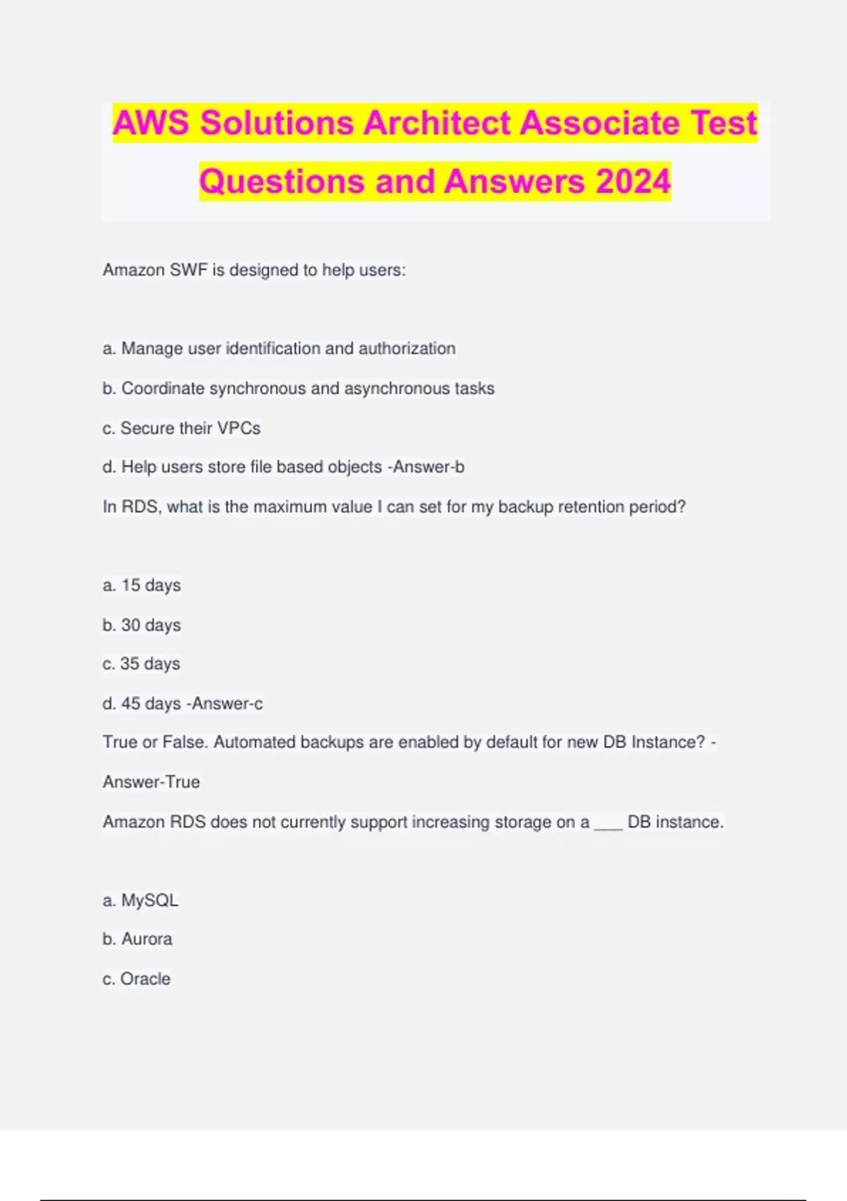 AWS Solutions Architect Associate Test Questions and Answers 2024 Amazon SWF is designed to help users: a. Manage user identification and authorization b. Coordinate synchronous and asynchronous tasks c. Secure their VPCs d. Help users store file based objects -Answer-b In RDS, what is the maximum value I can set for my backup retention period? a. 15 days b. 30 days c. 35 days d. 45 days -Answer-c True or False. Automated backups are enabled by default for new DB Instance? - Answer-True Amazon RDS does not currently support increasing storage on a ___ DB instance. a. MySQL b. Aurora c. Oracle d. MSSQL -Answer-d In what circumstances would I choose provisioned IOPS in RDS over standard storage? a. If you use production online transaction processing b. If you have workloads that are not sensitive to latency/lag c. If your business was trying to save money d. If this was a test DB -Answer-a Amazon S3 is a. Object Based Storage b. Block Based Storage c. A Data Warehouse Solution d. Suitable for data archival, not frequently used files. -Answer-a In S3 with RRS the availability is a. 99.% b. 100% c. 99% d. 99.99% -Answer-d Amazon's EBS volumes are a. Object based storage b. Block based storage c. Encrypted by default d. Not suitable for databases -Answer-b If I want to run a database on an EC2 instance, which is the most recommended Amazon storage option? a. RDS b. S3 c. Glacier d. EBS -Answer-d In S3 the durability of my files is a. 99.99% b. 99.% c. 99% d. 100% -Answer-b Can you access Amazon EBS Snapshots? a. Yes, through the AWS APIs/CLI & AWS Console b. No c. Depends on the region d. EBS does not have snapshot functionality -Answer-a A _____ is a document that provides a formal statement of one or more permissions