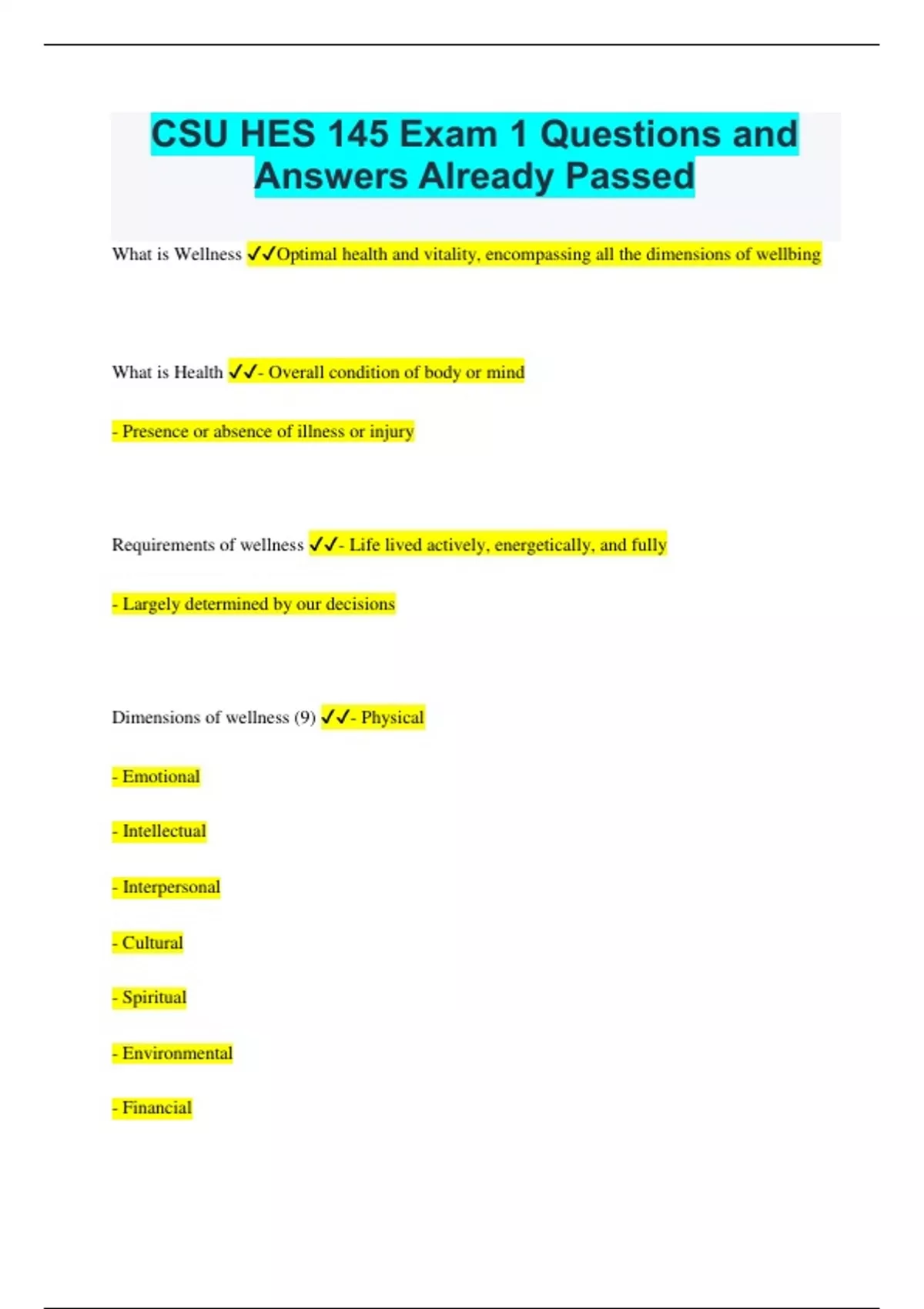 CSU HES 145 Exam 1 Questions and Answers Already Passed What is Wellness Optimal health and vitality, encompassing all the dimensions of wellbing What is Health - Overall condition of body or mind - Presence or absence of illness or injury Requirements of wellness - Life lived actively, energetically, and fully - Largely determined by our decisions Dimensions of wellness (9) - Physical - Emotional - Intellectual - Interpersonal - Cultural - Spiritual - Environmental - Financial - Occupational Physical Wellness - Eating well - Exercising - Avoiding harmful habits - Making responsible sexual decisions - Getting regular medical/dental checkups - Taking steps to avoid injuries - Recognizing symptoms of disease - Largely determines quality and quantity of life Emotional Wellness - Optimism - Trust - Self-acceptance - Self-esteem - Self-confidence (concept) - Ability to share feelings w/ others - Ability to understand and accept one's feelings Self-acceptance satisfaction w/ self (how we value ourselves) Self-esteem how I view myself and how I think others view me (how we feel about ourselves) Self-concept How we perceive ourselves Intellectual Wellness - Openness to new ideas - Capacity to question and think critically - Motivation to master new skills - Never stop learning - Curiosity (seek out new experiences and challenges) - Sense of humor Interpersonal Wellness - Satisfying relationships - Good communication skills - Developing a capacity for intimacy - Cultivating a support network of family/friends Cultural Wellness - Maintain/value your own cultural identity - Creating relationships w/ those who are different from you - Avoid stereotyping - Addresses individuals rather than groups