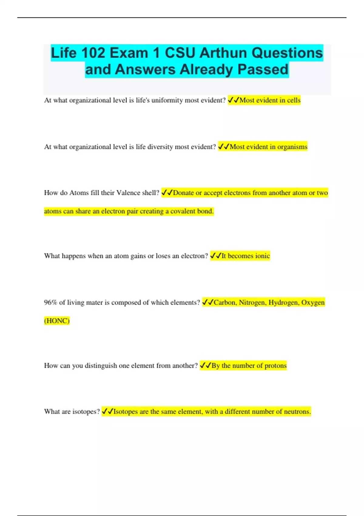 Life 102 Exam 1 CSU Arthun Questions and Answers Already Passed At what organizational level is life's uniformity most evident? Most evident in cells At what organizational level is life diversity most evident? Most evident in organisms How do Atoms fill their Valence shell? Donate or accept electrons from another atom or two atoms can share an electron pair creating a covalent bond. What happens when an atom gains or loses an electron? It becomes ionic 96% of living mater is composed of which elements? Carbon, Nitrogen, Hydrogen, Oxygen (HONC) How can you distinguish one element from another? By the number of protons What are isotopes? Isotopes are the same element, with a different number of neutrons. How do isotopes differ? Based on their number of neutrons What is a covalent bond? A covalent bond is when two atoms share an electron pair What is the difference between a polar and non-polar covalent bond? Polar covalent bond electrons are not equally shared between the two atoms, non-polar are equally shared How do atoms share a pair of electrons? Through covalent bonds What effect does the sharing of a pair of electrons have on their valence shells? They can fill their valence shells How many electrons does it take to fill the valence shells of C, H, O, N Carbon-4 Nitrogen-3 Oxygen-2 Hydrogen-1 Why are hydrogen bonds important for biological molecules? Example of a biological molecule that contains hydrogen bonds They are important because due to them water has a high heat of vaporization, it will cause a high specific heat as we. It is also important for giving stabilization without permanent bonds. DNA is an example of a biological molecule containing hydrogen bonds What does mass conservation law state? Mass can be changed from one form to another but the overall mass does not change (number of molecules doesn't change) What does it mean when a reaction is reversible? Because its a reaction that can go from reactants to products or products to reactants. What is chemical equilibrium? When the rate of the forward reaction is equal to the rate of the reverse reaction. Why is water a polar molecule? Because it has a partial negative charge and a partial positive charge because the oxygen is partially negatively charged and hydrogen is partially positive. What type of bonds do water molecules form with each other? Hydrogen bonds What are the properties of water? Cohesion, surface tension, high specific heat, heat of vaporization. Cohesion high surface tension surface tension measure of how hard it is to stretch/break the surface of a liquid high specific heat the amount of energy it takes for temperature to raise 1 degree Heat of Vaporization amount of energy it takes to go from a liquid to a gas What is the density of water at various temperatures? Water is frozen at 4 degrees celsius Why does ice float? Because water molecules are more spread out when frozen (expand)