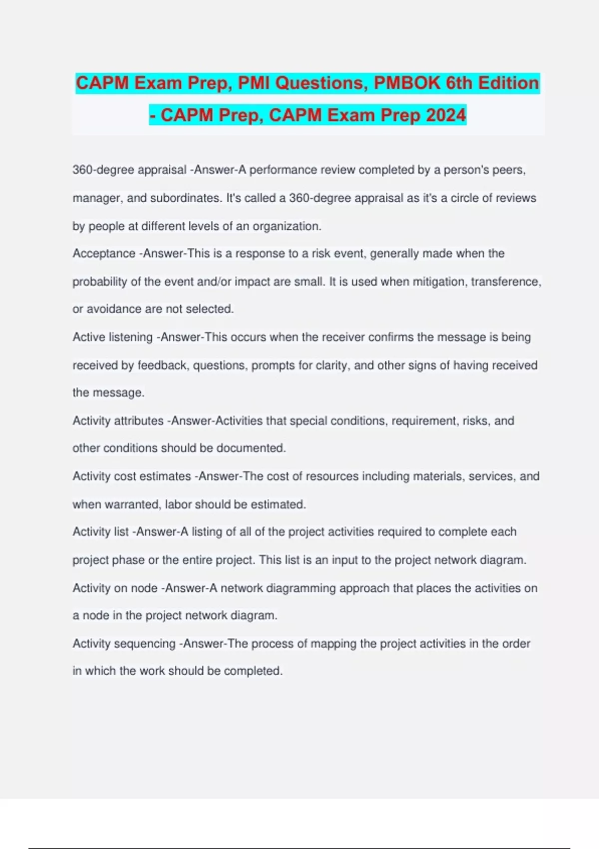 CAPM Exam Prep, PMI Questions, PMBOK 6th Edition - CAPM Prep, CAPM Exam Prep 2024 360-degree appraisal -Answer-A performance review completed by a person's peers, manager, and subordinates. It's called a 360-degree appraisal as it's a circle of reviews by people at different levels of an organization. Acceptance -Answer-This is a response to a risk event, generally made when the probability of the event and/or impact are small. It is used when mitigation, transference, or avoidance are not selected. Active listening -Answer-This occurs when the receiver confirms the message is being received by feedback, questions, prompts for clarity, and other signs of having received the message. Activity attributes -Answer-Activities that special conditions, requirement, risks, and other conditions should be documented. Activity cost estimates -Answer-The cost of resources including materials, services, and when warranted, labor should be estimated. Activity list -Answer-A listing of all of the project activities required to complete each project phase or the entire project. This list is an input to the project network diagram. Activity on node -Answer-A network diagramming approach that places the activities on a node in the project network diagram. Activity sequencing -Answer-The process of mapping the project activities in the order in which the work should be completed. Actual costs -Answer-The amount of funds the projects has spent to date. The difference between actual costs and earned value will reveal the cost variance. Adjourning -Answer-The final stage of team development; once the project is done, the team moves onto other assignments either as a unit or the project team ream is disbanded and individual team members go onto other work. Affinity diagram -Answer-Clusters like ideas together and allows for decomposition of ideas to compare and contrast project requirements. Analogous estimating -Answer-This relies on historical information to predict estimates for current projects. Analogous estimating is also known as top=down estimating and is a form of expert judgment. Application areas -Answer-The areas of discipline that a project may center upon. Consider technology, law, sales, marketing, and construction among many others. Assumption log -Answer-A document that clearly identifies and tracks assumptions that are made in the project. All assumptions need to be tested for their validity and the outcome of the test should be recorded. Autocratic -Answer-The project manager makes all of the decisions. Avoidance -Answer-This is one response to a risk event. The risk is avoided by planning a different technique to remove the risk from the project. Benchmarking -Answer-A process of using prior projects within or external to the performing organization to compare and set quality standards for processes and results. Benefit measurement methods -Answer-Project selection methods that compare the benefits of projects to determine which project the organization should select for investment.