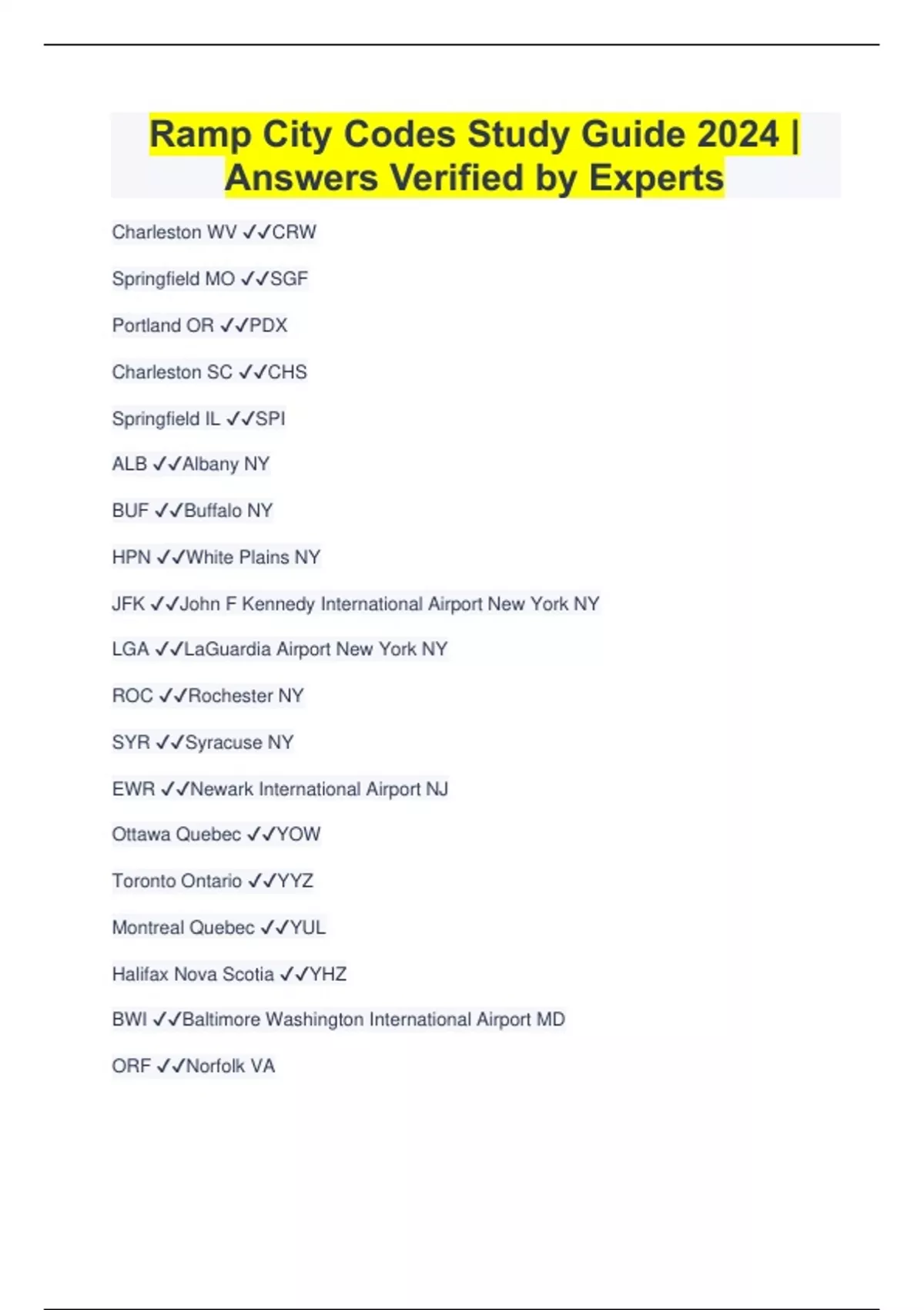 Ramp City Codes Study Guide 2024 | Answers Verified by Experts Charleston WV CRW Springfield MO SGF Portland OR PDX Charleston SC CHS Springfield IL SPI ALB Albany NY BUF Buffalo NY HPN White Plains NY JFK John F Kennedy International Airport New York NY LGA LaGuardia Airport New York NY ROC Rochester NY SYR Syracuse NY EWR Newark International Airport NJ Ottawa Quebec YOW Toronto Ontario YYZ Montreal Quebec YUL Halifax Nova Scotia YHZ BWI Baltimore Washington International Airport MD ORF Norfolk VA