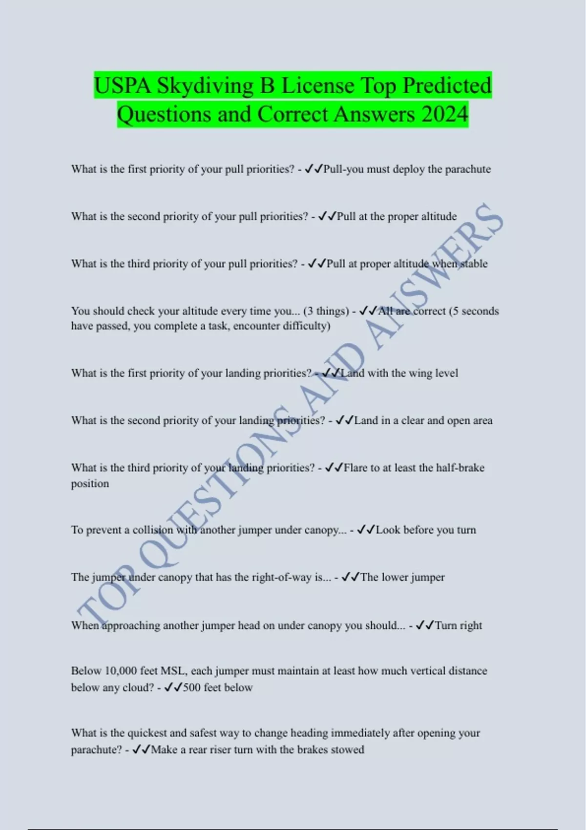 USPA Skydiving B License Top Predicted Questions and Correct Answers 2024