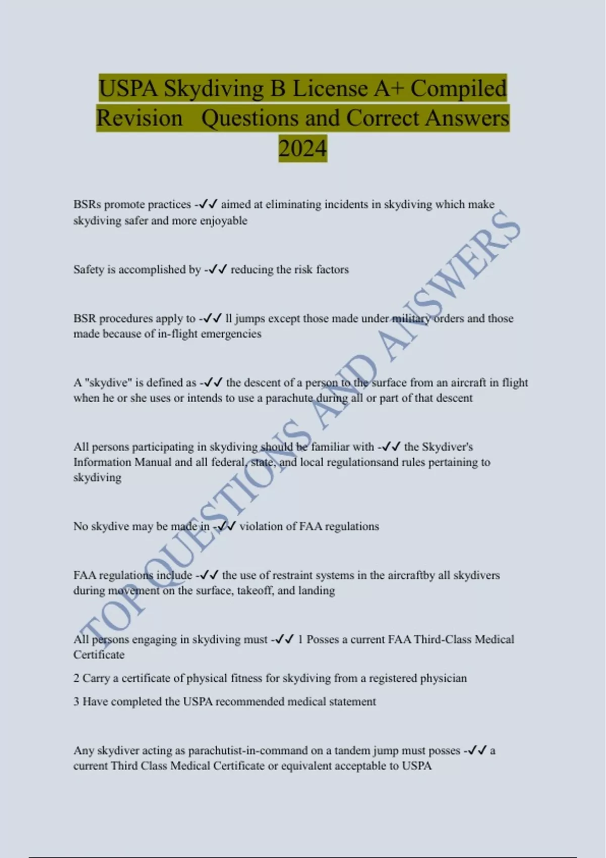 USPA Skydiving B License A+ Compiled Revision Questions and Correct Answers 2024