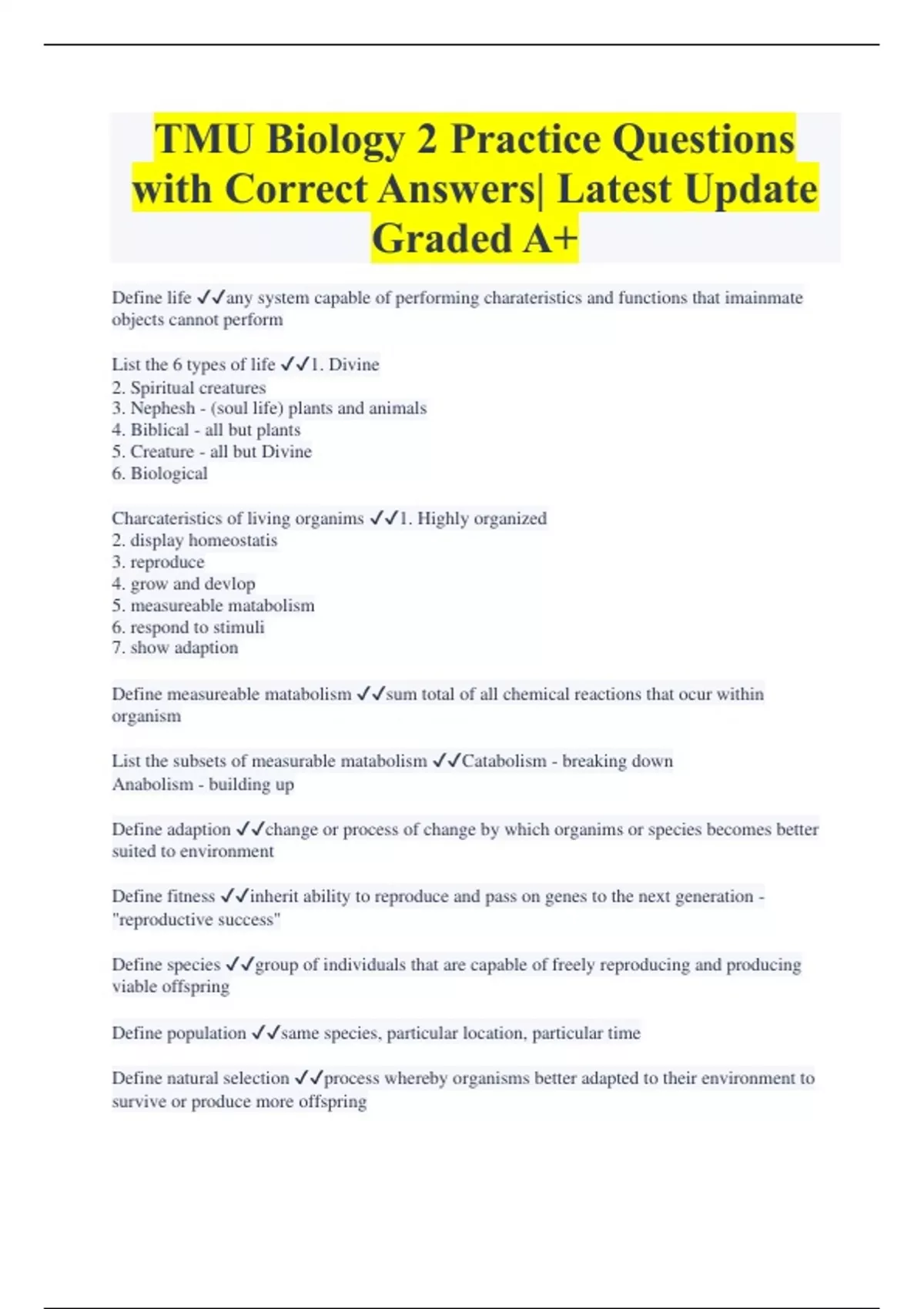 TMU Biology 2 Practice Questions with Correct Answers| Latest Update Graded A+ Define life any system capable of performing charateristics and functions that imainmate objects cannot perform List the 6 types of life 1. Divine 2. Spiritual creatures 3. Nephesh - (soul life) plants and animals 4. Biblical - all but plants 5. Creature - all but Divine 6. Biological Charcateristics of living organims 1. Highly organized 2. display homeostatis 3. reproduce 4. grow and devlop 5. measureable matabolism 6. respond to stimuli 7. show adaption Define measureable matabolism sum total of all chemical reactions that ocur within organism List the subsets of measurable matabolism Catabolism - breaking down Anabolism - building up Define adaption change or process of change by which organims or species becomes better suited to environment Define fitness inherit ability to reproduce and pass on genes to the next generation - "reproductive success" Define species group of individuals that are capable of freely reproducing and producing viable offspring Define population same species, particular location, particular time Define natural selection process whereby organisms better adapted to their environment to survive or produce more offspring