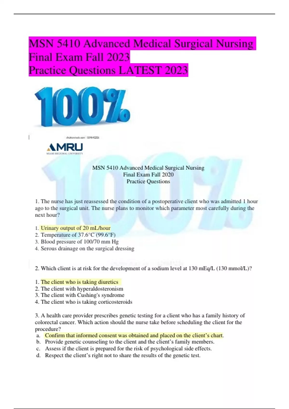 MSN 5410 Advanced Medical Surgical Nursing Final Exam Fall 2023 Practice Questions LATEST 20231. The nurse has just reassessed the condition of a postoperative client who was admitted 1 hour ago to the surgical unit. The nurse plans to monitor which parameter most carefully during the next hour? 1. Urinary output of 20 mL/hour 2. Temperature of 37.6°C (99.6°F) 3. Blood pressure of 100/70 mm Hg 4. Serous drainage on the surgical dressing 2. Which client is at risk for the development of a sodium level at 130 mEq/L (130 mmol/L)? 1. The client who is taking diuretics 2. The client with hyperaldosteronism 3. The client with Cushing's syndrome 4. The client who is taking corticosteroids 3. A health care provider prescribes genetic testing for a client who has a family history of colorectal cancer. Which action should the nurse take before scheduling the client for the procedure? a. Confirm that informed consent was obtained and placed on the client’s chart. b. Provide genetic counseling to the client and the client’s family members. c. Assess if the client is prepared for the risk of psychological side effects. d. Respect t