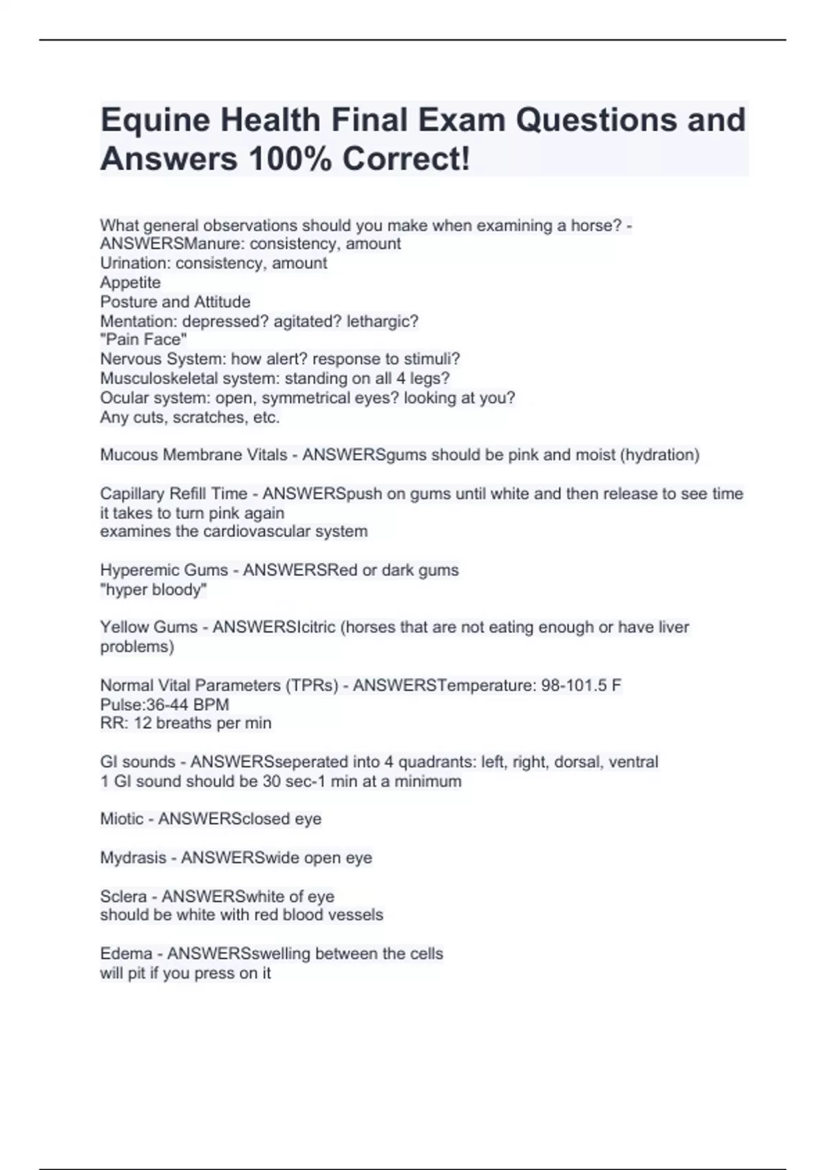 Equine Health Final Exam Questions and Answers 100% Correct!
