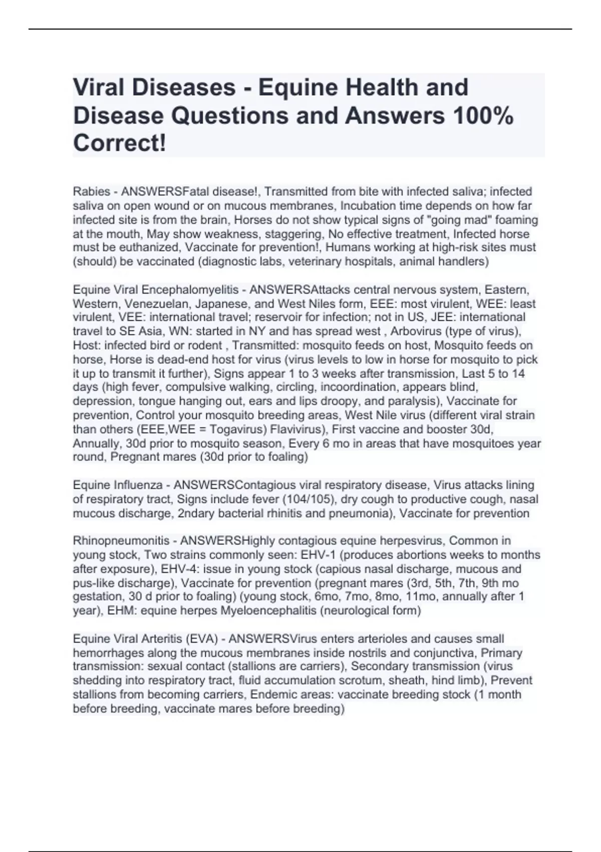 Viral Diseases - Equine Health and Disease Questions and Answers 100% Correct!