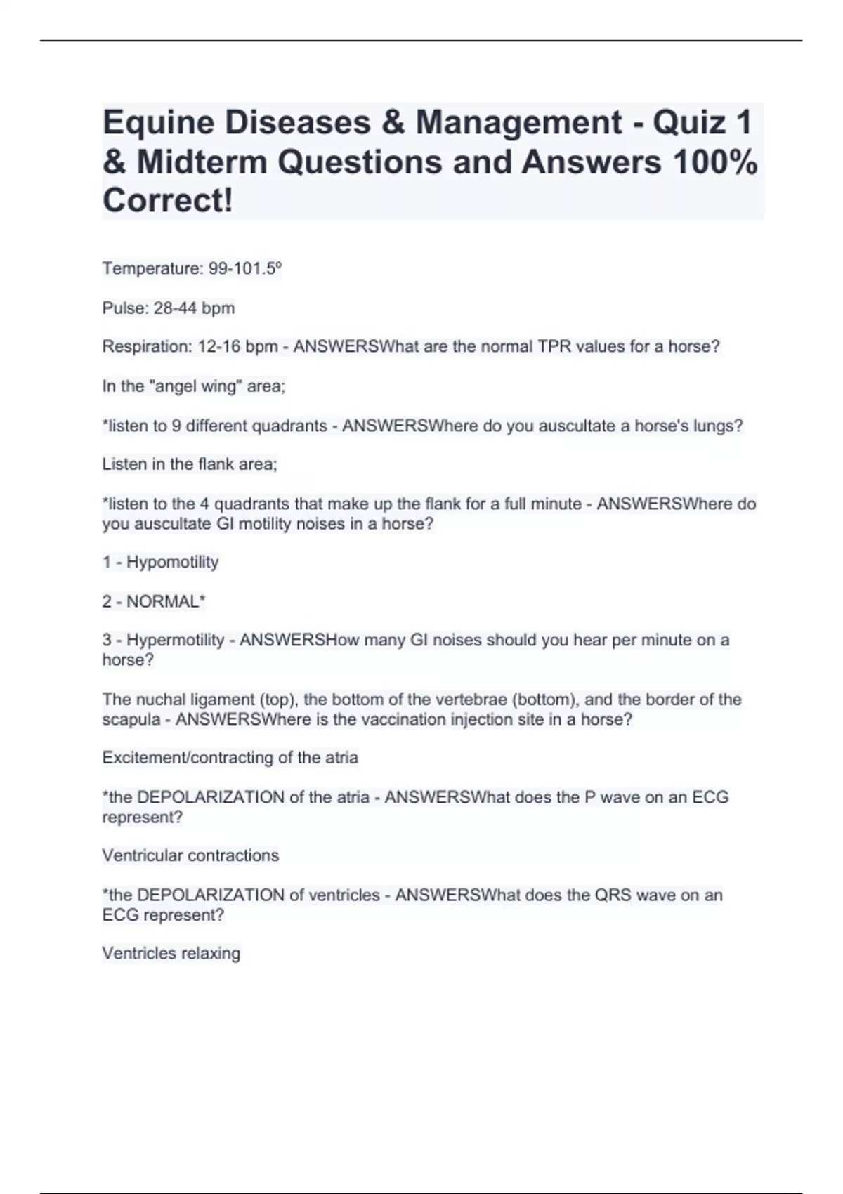Equine Diseases & Management - Quiz 1 & Midterm Questions and Answers 100% Correct!