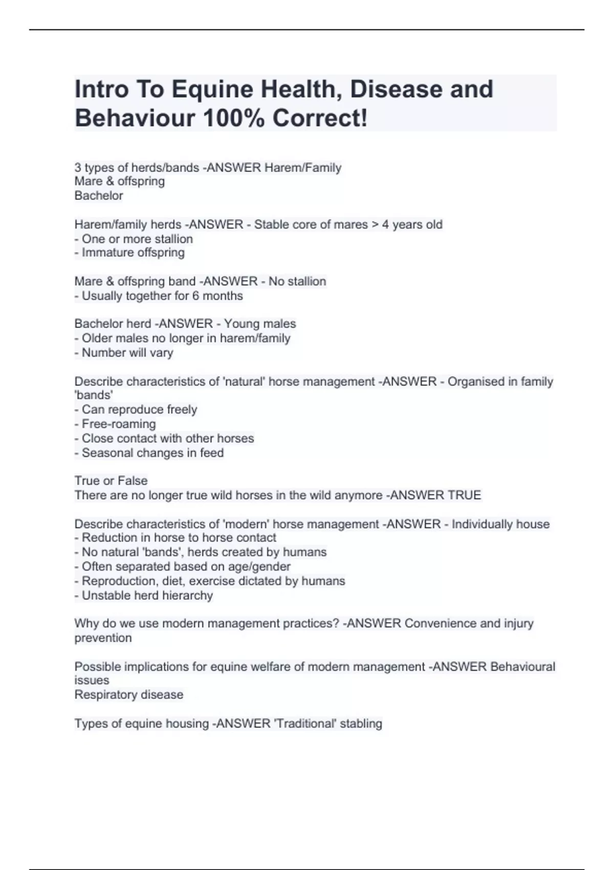3 types of herds/bands -ANSWER Harem/Family Mare & offspring Bachelor Harem/family herds -ANSWER - Stable core of mares > 4 years old - One or more stallion - Immature offspring Mare & offspring band -ANSWER - No stallion - Usually together for 6 months Bachelor herd -ANSWER - Young males - Older males no longer in harem/family - Number will vary Describe characteristics of 'natural' horse management -ANSWER - Organised in family 'bands' - Can reproduce freely - Free-roaming - Close contact with other horses - Seasonal changes in feed True or False There are no longer true wild horses in the wild anymore -ANSWER TRUE Describe characteristics of 'modern' horse management -ANSWER - Individually house - Reduction in horse to horse contact - No natural 'bands', herds created by humans - Often separated based on age/gender - Reproduction, diet, exercise dictated by humans - Unstable herd hierarchy Why do we use modern management practices? -ANSWER Convenience and injury prevention