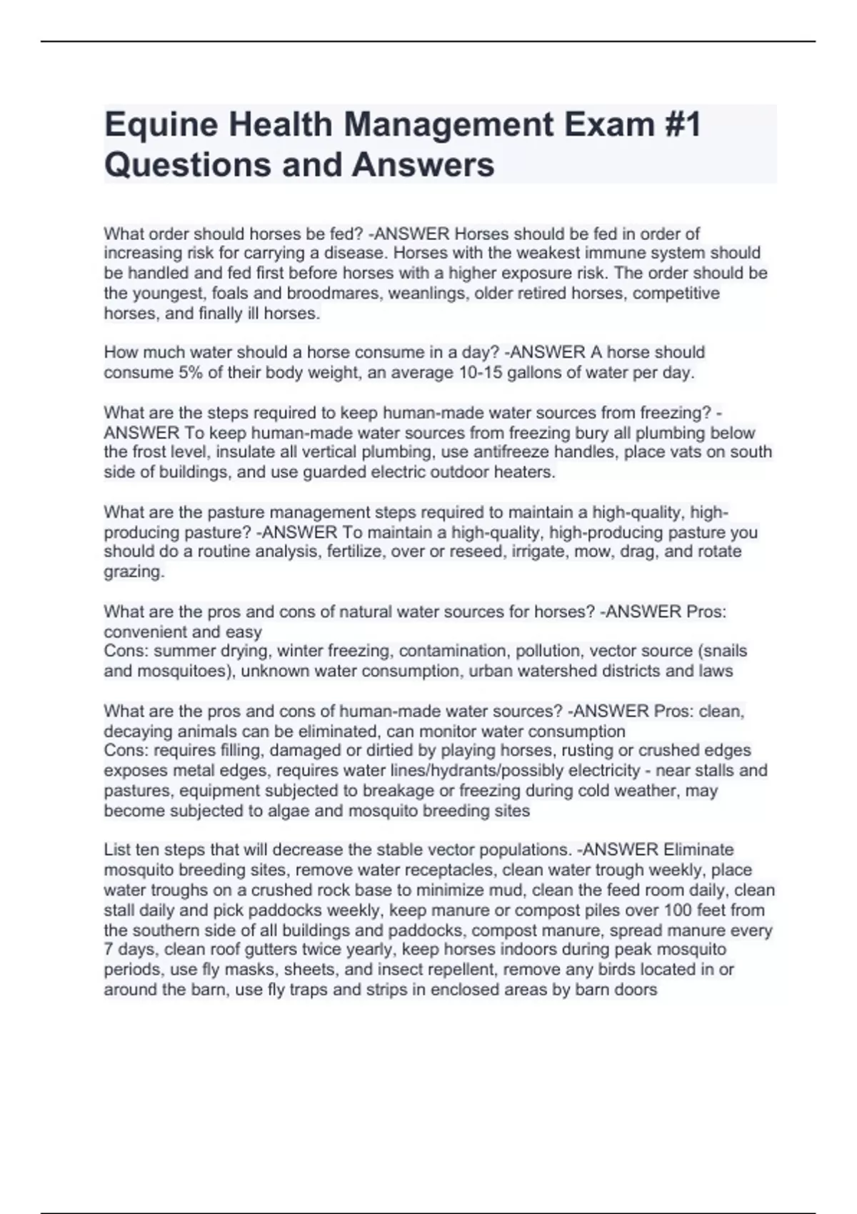 What order should horses be fed? -ANSWER Horses should be fed in order of increasing risk for carrying a disease. Horses with the weakest immune system should be handled and fed first before horses with a higher exposure risk. The order should be the youngest, foals and broodmares, weanlings, older retired horses, competitive horses, and finally ill horses. How much water should a horse consume in a day? -ANSWER A horse should consume 5% of their body weight, an average 10-15 gallons of water per day. What are the steps required to keep human-made water sources from freezing? -ANSWER To keep human-made water sources from freezing bury all plumbing below the frost level, insulate all vertical plumbing, use antifreeze handles, place vats on south side of buildings, and use guarded electric outdoor heaters. What are the pasture management steps required to maintain a high-quality, high-producing pasture? -ANSWER To maintain a high-quality, high-producing pasture you should do a routine analysis, fertilize, over or reseed, irrigate, mow, drag, and rotate grazing. What are the pros and cons of natural water sources for horses? -ANSWER Pros: convenient and easy Cons: summer drying, winter freezing, contamination, pollution, vector source (snails and mosquitoes), unknown water consumption, urban watershed districts and laws What are the pros and cons of human-made water sources? -ANSWER Pros: clean, decaying animals can be eliminated, can monitor water consumption Cons: requires filling, damaged or dirtied by playing horses, rusting or crushed edges exposes metal edges, requires water lines/hydrants/possibly electricity - near stalls and pastures, equipment subjected to breakage or freezing during cold weather, may become subjected to algae and mosquito breeding sites List ten steps that will decrease the stable vector populations. -ANSWER Eliminate mosquito breeding sites, remove water receptacles, clean water trough weekly, place water troughs on a crushed rock base to minimize mud, clean the feed room daily, clean stall daily and pick paddocks weekly, keep manure or compost piles over 100 feet from the southern side of all buildings and paddocks, compost manure, spread manure every 7 days, clean roof gutters twice yearly, keep horses indoors during peak mosquito periods, use fly masks, sheets, and insect repellent, remove any birds located in or around the barn, use fly traps and strips in enclosed areas by barn doors