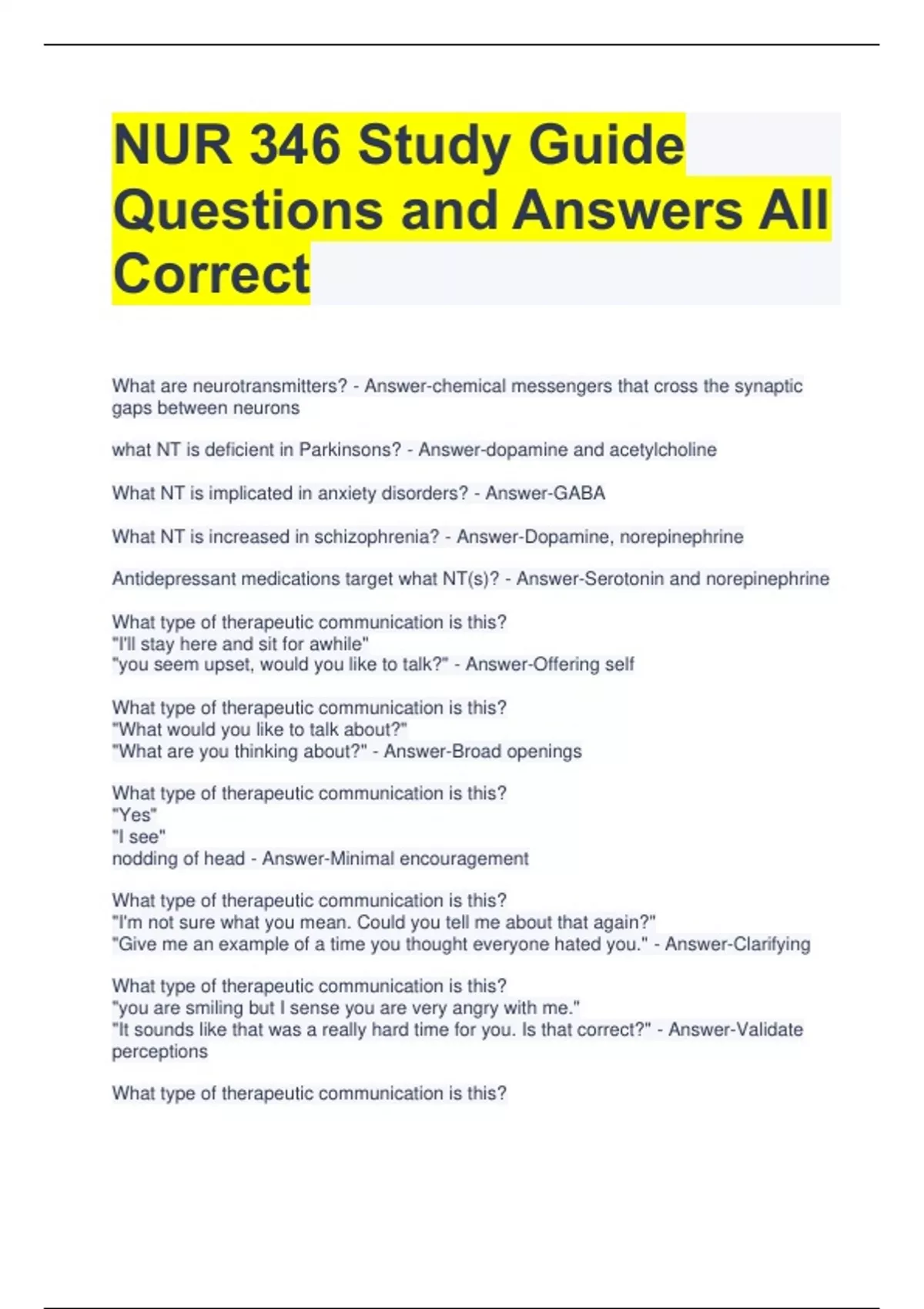 NUR 346 Study Guide Questions and Answers All Correct What are neurotransmitters? - Answer-chemical messengers that cross the synaptic gaps between neurons what NT is deficient in Parkinsons? - Answer-dopamine and acetylcholine What NT is implicated in anxiety disorders? - Answer-GABA What NT is increased in schizophrenia? - Answer-Dopamine, norepinephrine Antidepressant medications target what NT(s)? - Answer-Serotonin and norepinephrine What type of therapeutic communication is this? "I'll stay here and sit for awhile" "you seem upset, would you like to talk?" - Answer-Offering self What type of therapeutic communication is this? "What would you like to talk about?" "What are you thinking about?" - Answer-Broad openings What type of therapeutic communication is this? "Yes" "I see" nodding of head - Answer-Minimal encouragement What type of therapeutic communication is this? "I'm not sure what you mean. Could you tell me about that again?" "Give me an example of a time you thought everyone hated you." - Answer-Clarifying What type of therapeutic communication is this? "you are smiling but I sense you are very angry with me." "It sounds like that was a really hard time for you. Is that correct?" - Answer-Validate perceptions What type of therapeutic communication is this?