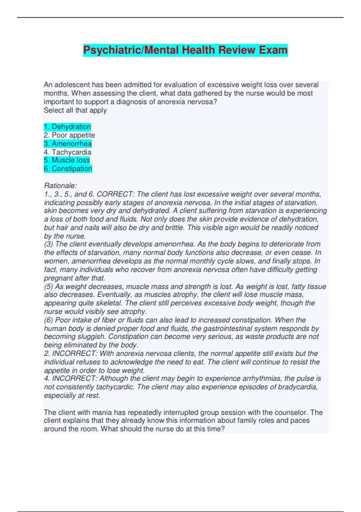 Psychiatric/Mental Health Review Exam - Questions, Answers and Rationales