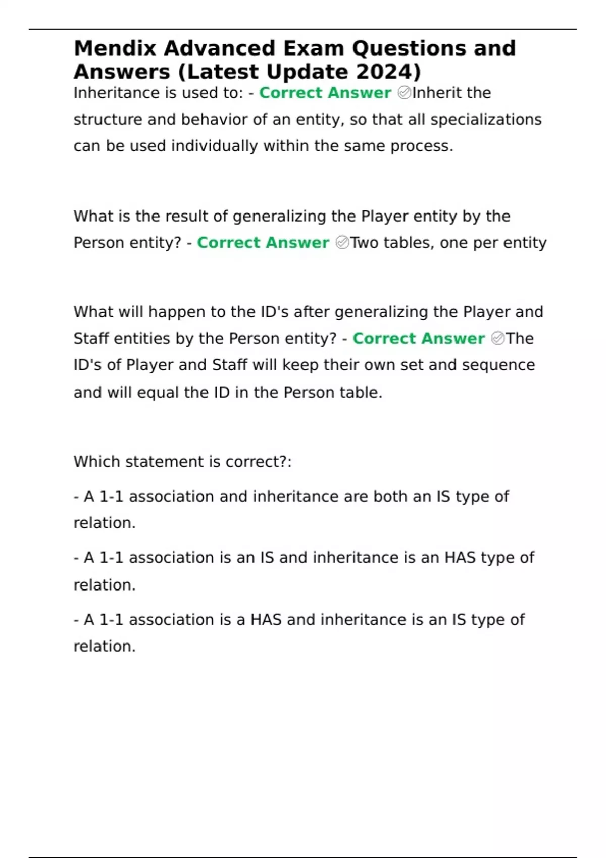 Inheritance is used to: - Correct Answer ✅Inherit the structure and behavior of an entity, so that all specializations can be used individually within the same process.