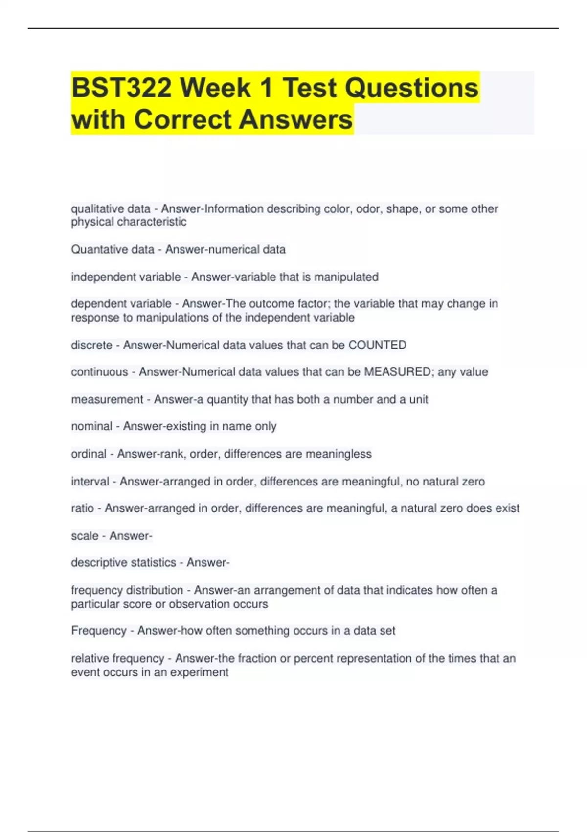 BST322 Week 1 Test Questions with Correct Answers qualitative data - Answer-Information describing color, odor, shape, or some other physical characteristic Quantative data - Answer-numerical data independent variable - Answer-variable that is manipulated dependent variable - Answer-The outcome factor; the variable that may change in response to manipulations of the independent variable discrete - Answer-Numerical data values that can be COUNTED continuous - Answer-Numerical data values that can be MEASURED; any value measurement - Answer-a quantity that has both a number and a unit nominal - Answer-existing in name only ordinal - Answer-rank, order, differences are meaningless interval - Answer-arranged in order, differences are meaningful, no natural zero ratio - Answer-arranged in order, differences are meaningful, a natural zero does exist scale - Answer- descriptive statistics - Answer- frequency distribution - Answer-an arrangement of data that indicates how often a particular score or observation occurs