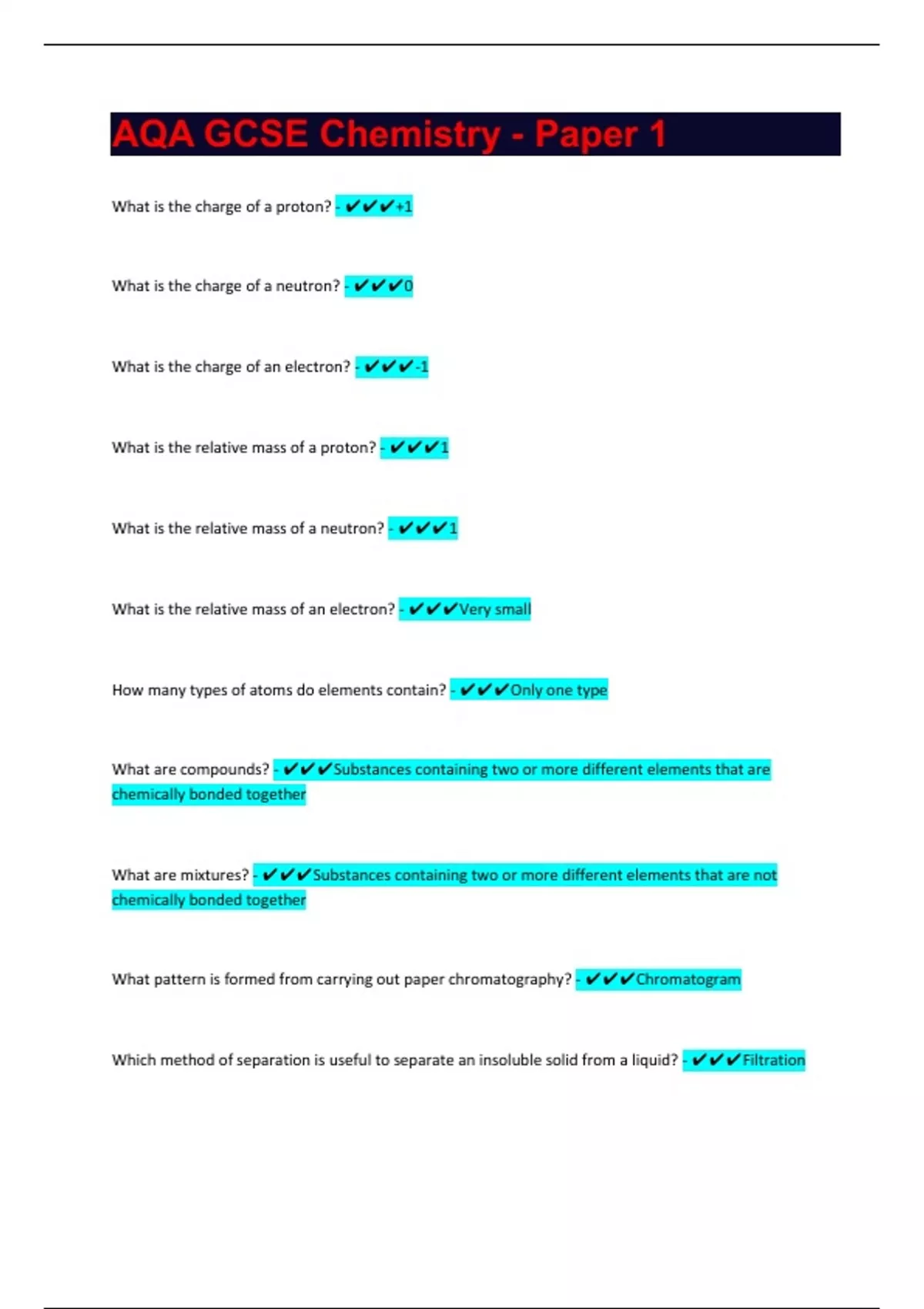 What is the charge of a proton? - +1 What is the charge of a neutron? - 0 What is the charge of an electron? - -1 What is the relative mass of a proton? - 1 What is the relative mass of a neutron? - 1 What is the relative mass of an electron? - Very small How many types of atoms do elements contain? - Only one type What are compounds? - Substances containing two or more different elements that are chemically bonded together What are mixtures? - Substances containing two or more different elements that are not chemically bonded together What pattern is formed from carrying out paper chromatography? - Chromatogram Which method of separation is useful to separate an insoluble solid from a liquid? - Filtration Which method of separation is useful to separate a soluble solid from a liquid? - Evaporation or Crystillisation Which method of distillation separates liquids with similar boiling points? - Fractional distillation Who discovered that the plum pudding model was wrong? - Ernest Rutherford Who devised an experiment that proved the existence of the neutron? - Niels Bohr Why did Mendeleev leave gaps in his Table of Elements? - To ensure that elements with similar properties stayed in the same groups. The gaps indicated the existence of undiscovered elements and allowed Mendeleev to predict what their properties might be How are the group number and the number of electrons in the outer shell of an element related? - The group number tells you how many electrons are in the outer shell of an element. E.g. sodium is in Group 1 therefore it has 1 electron on its outer shell What kind of ions do metals form? - Positive Where are the non-metals on the periodic table? - On the right hand side Give three properties which are specific to transition metals - 1) They can form more than one ion e.g cobalt form Co2+ 2) They are often coloured, therefore compounds which contain them are colourful e.g. potassium chromate is yellow 3) They often make good catalysts e.g. nickel based catalysts are used in the hydrogenation of alkenes