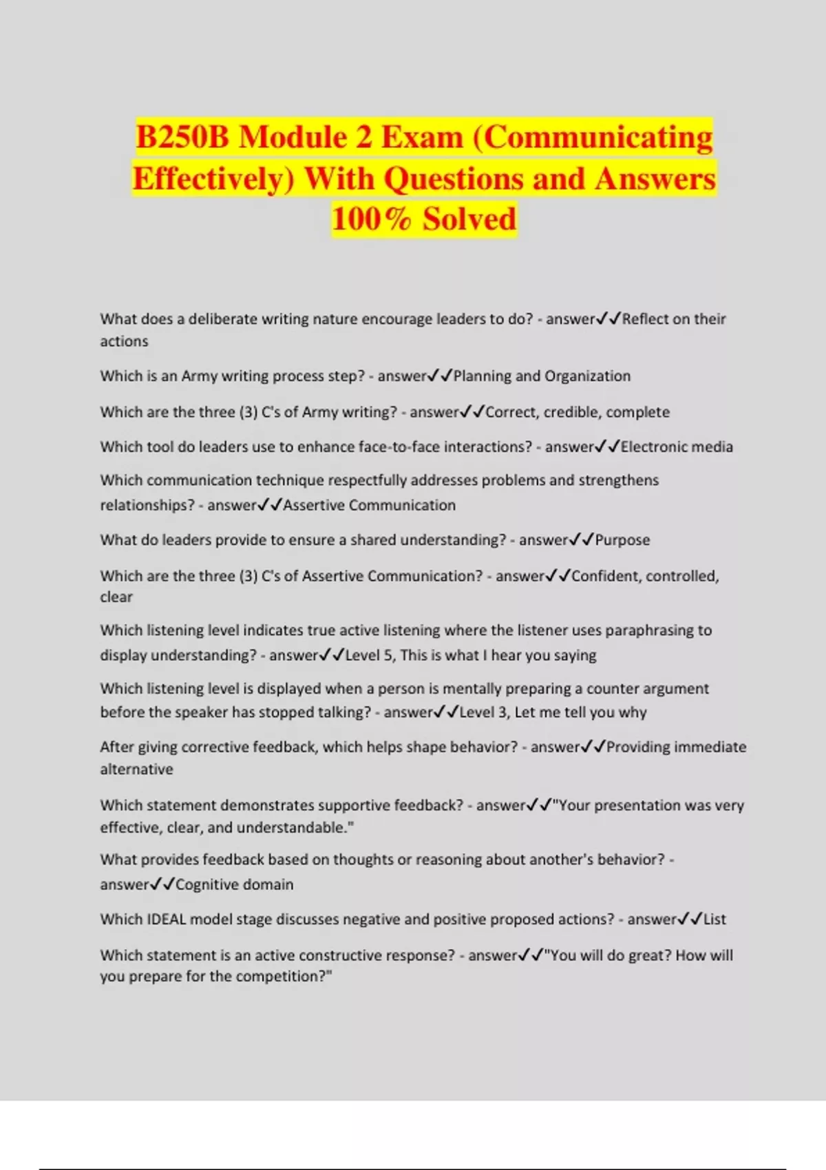 B250B Module 2 Exam (Communicating Effectively) With Questions and Answers 100% Solved What does a deliberate writing nature encourage leaders to do? - answerReflect on their actions Which is an Army writing process step? - answerPlanning and Organization Which are the three (3) C's of Army writing? - answerCorrect, credible, complete Which tool do leaders use to enhance face-to-face interactions? - answerElectronic media Which communication technique respectfully addresses problems and strengthens relationships? - answerAssertive Communication What do leaders provide to ensure a shared understanding? - answerPurpose Which are the three (3) C's of Assertive Communication? - answerConfident, controlled, clear Which listening level indicates true active listening where the listener uses paraphrasing to display understanding? - answerLevel 5, This is what I hear you saying Which listening level is displayed when a person is mentally preparing a counter argument before the speaker has stopped talking? - answerLevel 3, Let me tell you why After giving corrective feedback, which helps shape behavior? - answerProviding immediate alternative Which statement demonstrates supportive feedback? - answer"Your presentation was very effective, clear, and understandable." What provides feedback based on thoughts or reasoning about another's behavior? - answerCognitive domain Which IDEAL model stage discusses negative and positive proposed actions? - answerList Which statement is an active constructive response? - answer"You will do great? How will you prepare for the competition?"