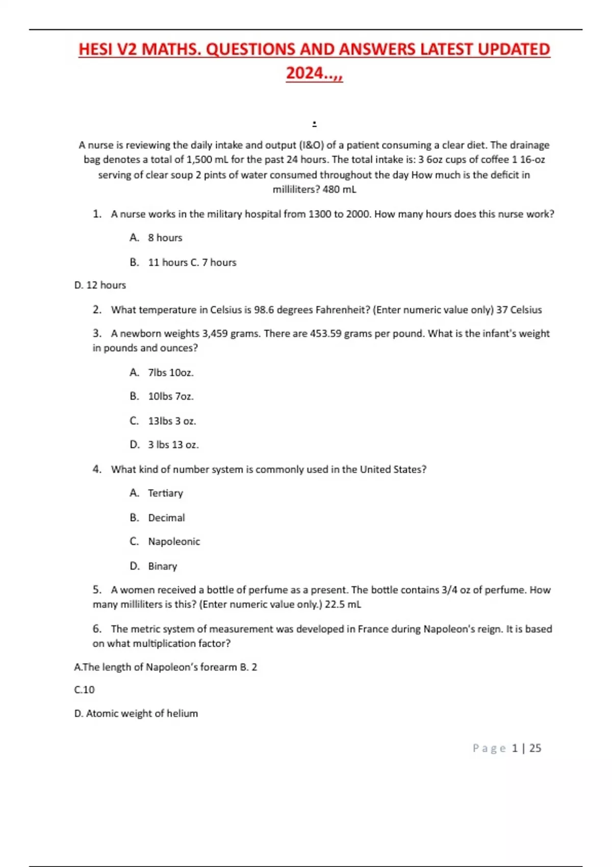 HESI V2 MATHS. QUESTIONS AND ANSWERS LATEST UPDATED 2024..