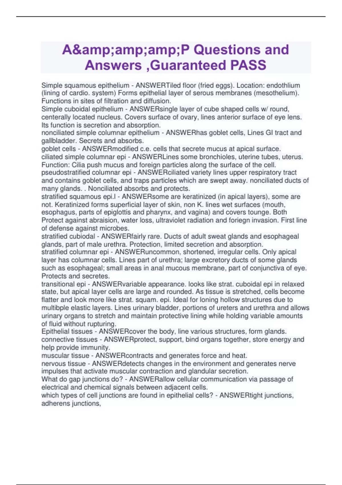 Simple squamous epithelium - ANSWERTiled floor (fried eggs). Location: endothlium (lining of cardio. system) Forms epithelial layer of serous membranes (mesothelium). Functions in sites of filtration and diffusion. Simple cuboidal epithelium - ANSWERsingle layer of cube shaped cells w/ round, centerally located nucleus. Covers surface of ovary, lines anterior surface of eye lens. Its function is secretion and absorption. nonciliated simple columnar epithelium - ANSWERhas goblet cells, Lines GI tract and gallbladder. Secrets and absorbs. goblet cells - ANSWERmodified c.e. cells that secrete mucus at apical surface. ciliated simple columnar epi - ANSWERLines some bronchioles, uterine tubes, uterus. Function: Cilia push mucus and foreign particles along the surface of the cell. pseudostratified columnar epi - ANSWERciliated variety lines upper respiratory tract and contains goblet cells, and traps particles which are swept away. nonciliated ducts of many glands. . Nonciliated absorbs and protects. stratified squamous epi.l - ANSWERsome are keratinized (in apical layers), some are not. Keratinized forms superficial layer of skin, non K. lines wet surfaces (mouth, esophagus, parts of epiglottis and pharynx, and vagina) and covers tounge. Both Protect against abraision, water loss, ultraviolet radiation and foriegn invasion. First line of defense against microbes. stratified cubiodal - ANSWERfairly rare. Ducts of adult sweat glands and esophageal glands, part of male urethra. Protection, limited secretion and absorption. stratified columnar epi - ANSWERuncommon, shortened, irregular cells. Only apical layer has columnar cells. Lines part of urethra; large excretory ducts of some glands such as esophageal; small areas in anal mucous membrane, part of conjunctiva of eye. Protects and secretes. transitional epi - ANSWERvariable appearance. looks like strat. cuboidal epi in relaxed state, but apical layer cells are large and rounded. As tissue is stretched, cells become flatter and look more like strat. squam. epi. Ideal for loning hollow structures due to multibple elastic layers. Lines urinary bladder, portions of ureters and urethra and allows urinary organs to stretch and maintain protective lining while holding variable amounts of fluid without rupturing. Epithelial tissues - ANSWERcover the body, line various structures, form glands. connective tissues - ANSWERprotect, support, bind organs together, store energy and help provide immunity. muscular tissue - ANSWERcontracts and generates force and heat. nervous tissue - ANSWERdetects changes in the environment and generates nerve impulses that activate muscular contraction and glandular secretion. What do gap junctions do? - ANSWERallow cellular communication via passage of electrical and chemical signals between adjacent cells. which types of cell junctions are found in epithelial cells? - ANSWERtight junctions, adherens junctions, Which type of junction prevents the contents of organs from leaking into surrounding tissues? - ANSWERtight junctions. Why are epithelial and connective tissues found adjacent to each other? - ANSWERBecause epithelial tissues lack blood vessles and form surfaces, they are always found immediately adjacent to blood vessel rich connective tissue. This allows them to make exchanges with the blood necessary for the delivery of oxygen and nutrients and the removal of wastes. (this is critical to their survival). which cell shape is best adapted for the rapid movement of substances from one cell to another ? - ANSWERSubstances move more quickly through squamous cells because they are so thin. what are the functions of the basement membrane? - ANSWERthe basement membrane plays a part in growth and wound healing, and proveides physical support for the epithelium. what is a burn - ANSWERtissue damage caused by excessive heat, electricity, radioactivity, or corrosive chemicals that denature proteins in the cells. what are the skins three main contributions to homeostasis that are a major consideration for a burn victim? - ANSWERprotection against microbial invasion, dehydration and thermoregulation. First degree - ANSWERonly epidermis. mild pain and redness, no blisters. Second degree - ANSWERdestroys the epidermis and part of the dermis - some skin functions are lost. Redness, blister formation, edema, and pain result. Third degree - ANSWERfull-thickness burn (destroys the epidermis, dermis, and subcutaneous layer). Most skin functions are lost, and the region is numb because sensory nerve endings have been destroyed. a major burn includes - ANSWER3rd over 10% of body surface area; or 2o burns over 25% of body surface area; or Any 3o burns on the face, hands, feet, or perineum (which includes the anal and urogenital regions) what are the two major types of epithelial tissue? - ANSWERglandular and covering/lining. Basement membrane - ANSWERthin, extracellular layer consisting of basil lamina and reticular lamina. basil lamina - ANSWERthin layer, closer (and secreted by) epithelil cells. contains laminin and hes epithelial cells to basement membrane. reticular lamina - ANSWERcloser to underlying connective tissue, contains fibroblasts. attaches and supports overlying epi. tissue. also participates in filtration of blood in kidneys. covering and lining epi. - ANSWERforms outer covering of skin and some internal organs. forms inner lining of blood vessles, ducts, body cavities and interior of respiratory, digestive, urinary and reproductive. glandular epi. - ANSWERmakes up secreting portion of thyroid, adrenal and sweat glands. which cell shape is best adapted for the rapid movement of substa