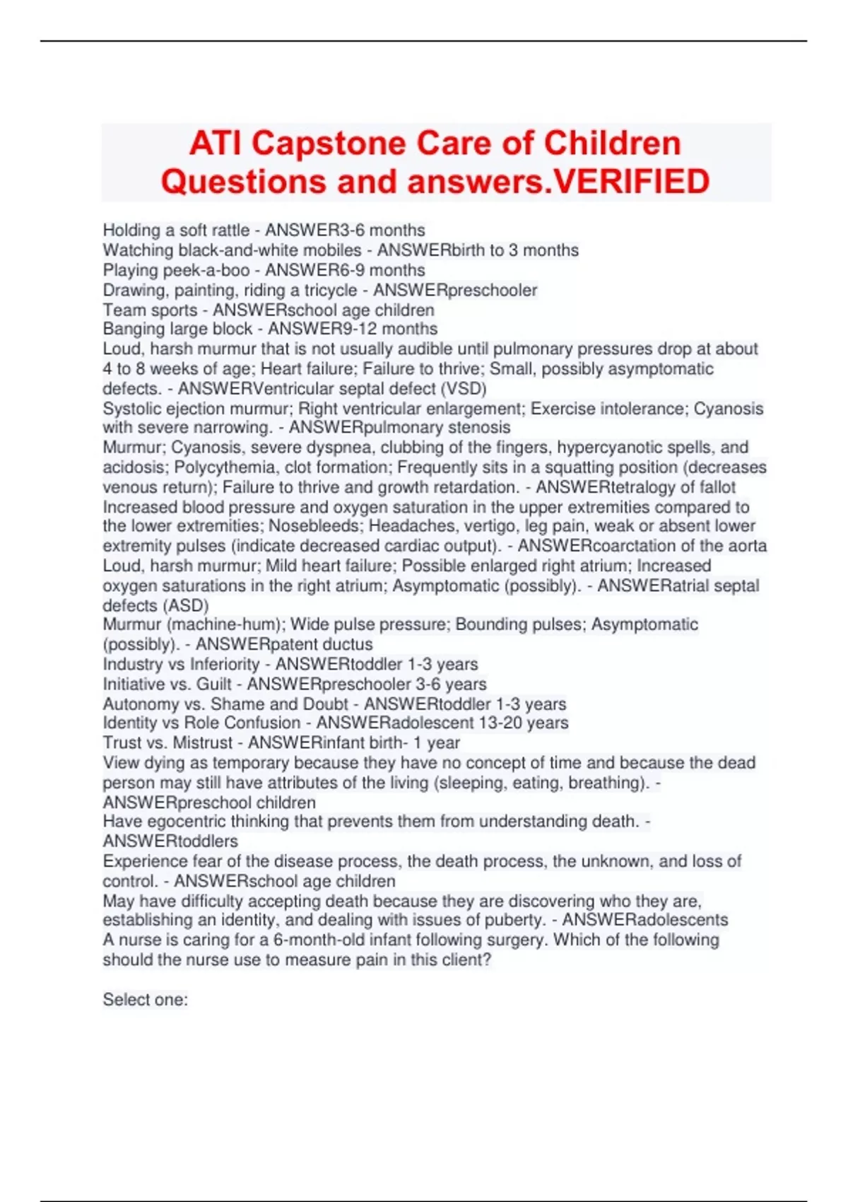 Holding a soft rattle - ANSWER3-6 months Watching black-and-white mobiles - ANSWERbirth to 3 months Playing peek-a-boo - ANSWER6-9 months Drawing, painting, riding a tricycle - ANSWERpreschooler Team sports - ANSWERschool age children Banging large block - ANSWER9-12 months Loud, harsh murmur that is not usually audible until pulmonary pressures drop at about 4 to 8 weeks of age; Heart failure; Failure to thrive; Small, possibly asymptomatic defects. - ANSWERVentricular septal defect (VSD) Systolic ejection murmur; Right ventricular enlargement; Exercise intolerance; Cyanosis with severe narrowing. - ANSWERpulmonary stenosis Murmur; Cyanosis, severe dyspnea, clubbing of the fingers, hypercyanotic spells, and acidosis; Polycythemia, clot formation; Frequently sits in a squatting position (decreases venous return); Failure to thrive and growth retardation. - ANSWERtetralogy of fallot Increased blood pressure and oxygen saturation in the upper extremities compared to the lower extremities; Nosebleeds; Headaches, vertigo, leg pain, weak or absent lower extremity pulses (indicate decreased cardiac output). - ANSWERcoarctation of the aorta Loud, harsh murmur; Mild heart failure; Possible enlarged right atrium; Increased oxygen saturations in the right atrium; Asymptomatic (possibly). - ANSWERatrial septal defects (ASD) Murmur (machine-hum); Wide pulse pressure; Bounding pulses; Asymptomatic (possibly). - ANSWERpatent ductus Industry vs Inferiority - ANSWERtoddler 1-3 years Initiative vs. Guilt - ANSWERpreschooler 3-6 years Autonomy vs. Shame and Doubt - ANSWERtoddler 1-3 years Identity vs Role Confusion - ANSWERadolescent 13-20 years Trust vs. Mistrust - ANSWERinfant birth- 1 year View dying as temporary because they have no concept of time and because the dead person may still have attributes of the living (sleeping, eating, breathing). - ANSWERpreschool children Have egocentric thinking that prevents them from understanding death. - ANSWERtoddlers Experience fear of the disease process, the death process, the unknown, and loss of control. - ANSWERschool age children May have difficulty accepting death because they are discovering who they are, establishing an identity, and dealing with issues of puberty. - ANSWERadolescents A nurse is caring for a 6-month-old infant following surgery. Which of the following should the nurse use to measure pain in this client? Select one: a. Oucher numeric scale. b. Wong-Baker faces pain rating scale. c. FLACC pain scale. d. There is no special pain scale for infants. - ANSWERFLACC pain scale A nurse is caring for an infant following a cleft lip and palate repair. Which of the following actions should the nurse take in the post-operative period? Select one: a. Encourage the use of a pacifier. b. Provide hard toys. c. Administer analgesics. d. Assess incision using tongue blade. - ANSWERadminister analgesics A nurse is caring for a child with a closed head injury. Which of the following interventions should the nurse institute to decrease intracranial pressure? Select all that apply. Select one or more: a. Provide a calm, restful environment. b. Keep the body in alignment. c. Keep the head of the bed flat. d. Avoid extreme flexion, extension or rotation of the head. e. Instruct to avoid coughing and blowing nose. - ANSWERAvoid extreme flexion, extension or rotation of the head., Keep the body in alignment., Instruct to avoid coughing and blowing nose., Provide a calm, restful environment. Which of the following is the priority intervention a nurse should take when caring for a child who just experienced a febrile seizure? Select one: a. Reorient to the environment. b. Take vital signs. c. Check for injuries. d. Keep in a side-lying position. - ANSWERKeep in a side-lying position. A nurse is providing discharge education to the parents of a child experiencing acute diarrhea secondary to gastroenteritis. Which of the following should the nurse include?