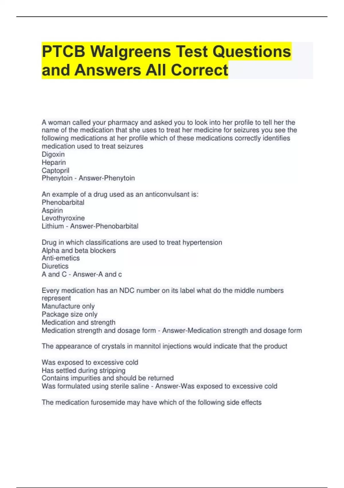 PTCB Walgreens Test Questions and Answers All Correct A woman called your pharmacy and asked you to look into her profile to tell her the name of the medication that she uses to treat her medicine for seizures you see the following medications at her profile which of these medications correctly identifies medication used to treat seizures Digoxin Heparin Captopril Phenytoin - Answer-Phenytoin An example of a drug used as an anticonvulsant is: Phenobarbital Aspirin Levothyroxine Lithium - Answer-Phenobarbital Drug in which classifications are used to treat hypertension Alpha and beta blockers Anti-emetics Diuretics A and C - Answer-A and c Every medication has an NDC number on its label what do the middle numbers represent Manufacture only Package size only Medication and strength Medication strength and dosage form - Answer-Medication strength and dosage form The appearance of crystals in mannitol injections would indicate that the product Was exposed to excessive cold Has settled during stripping Contains impurities and should be returned Was formulated using sterile saline - Answer-Was exposed to excessive cold