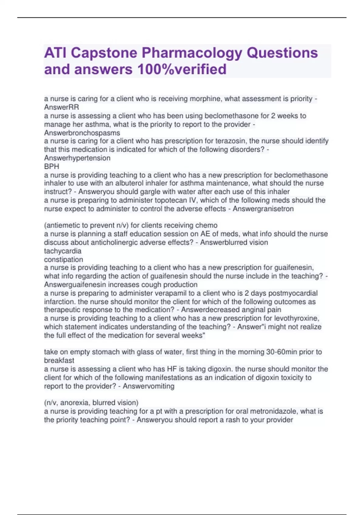 a nurse is caring for a client who is receiving morphine, what assessment is priority - AnswerRR a nurse is assessing a client who has been using beclomethasone for 2 weeks to manage her asthma, what is the priority to report to the provider - Answerbronchospasms a nurse is caring for a client who has prescription for terazosin, the nurse should identify that this medication is indicated for which of the following disorders? - Answerhypertension BPH a nurse is providing teaching to a client who has a new prescription for beclomethasone inhaler to use with an albuterol inhaler for asthma maintenance, what should the nurse instruct? - Answeryou should gargle with water after each use of this inhaler a nurse is preparing to administer topotecan IV, which of the following meds should the nurse expect to administer to control the adverse effects - Answergranisetron (antiemetic to prevent n/v) for clients receiving chemo a nurse is planning a staff education session on AE of meds, what info should the nurse discuss about anticholinergic adverse effects? - Answerblurred vision tachycardia constipation a nurse is providing teaching to a client who has a new prescription for guaifenesin, what info regarding the action of guaifenesin should the nurse include in the teaching? - Answerguaifenesin increases cough production a nurse is preparing to administer verapamil to a client who is 2 days postmyocardial infarction. the nurse should monitor the client for which of the following outcomes as therapeutic response to the medication? - Answerdecreased anginal pain a nurse is providing teaching to a client who has a new prescription for levothyroxine, which statement indicates understanding of the teaching? - Answer"i might not realize the full effect of the medication for several weeks" take on empty stomach with glass of water, first thing in the morning 30-60min prior to breakfast a nurse is assessing a client who has HF is taking digoxin. the nurse should monitor the client for which of the following manifestations as an indication of digoxin toxicity to report to the provider? - Answervomiting (n/v, anorexia, blurred vision) a nurse is providing teaching for a pt with a prescription for oral metronidazole, what is the priority teaching point? - Answeryou should report a rash to your provider (fatal disorder Stevens-Johnson syndrome) a nurse is providing discharge instructions to a client who has a new prescription for codeine for cough suppression, what is the priority instruction? - Answermove slowly when standing from a lying down position (r/f orthostatic hypotension) a nurse is reviewing the medical record of a client who received his medications 1 hour ago, the pt reports chest pain, this can be an AE of what med? - Answeralbuterol (beta2agonist, controls bronchospasm for asthma--can cause tremors, chest pain, tachycardia, dysrhythmias) a nurse is teaching a pt who has a new prescription for brimonidine to treat open-angle glaucoma, what indicates an understanding of the instructions? - Answeri can expect to feel some irritation when i put these drops in my eyes a nurse is caring for a female client who has osteoporosis and a new prescription for raloxifene, what should the nurse assess prior to initiating therapy? - Answerpregnancy status (risk category X) a nurse is teaching a pt to use TD nitroglycerin patches to treat angina pectoris, what instructions should she include? - Answerapply a new patch every morning (effects begin 30-60 min after application and last 14 hours) a nurse is providing teaching to a pt who has a new prescription for allopurinol to treat gout, what should the nurse include? - Answerincrease your fluid intake a nurse is teaching a client who has a new prescription for alprazolam to treat an anxiety disorder, what should the nurse include? - Answeravoid taking this med with GFJ (take with food to reduce gastric distress) a nurse is providing teaching to a pt who has hypertension and a new prescription for clonidine twice daily, the client understands when he says - Answeri will stop drinking a glass of red wine at night (avoid due to the additive CNS effects) a nurse is providing teaching to a client who has a neuropathic pain and a new prescription for amitriptyline once per day, what should the nurse include? - Answerincrease fluids while on this med (urine turns blue/green, sedation is an AE) a nurse is caring for a client who has a prescription for vancomycin 1g IV intermittent infusion over 30min every 12 hours, what should the nurse take? - Answercontact the provider for prescription clarification (administer over 60min or more to reduce risk of infusion reaction--hypotension, flushing)