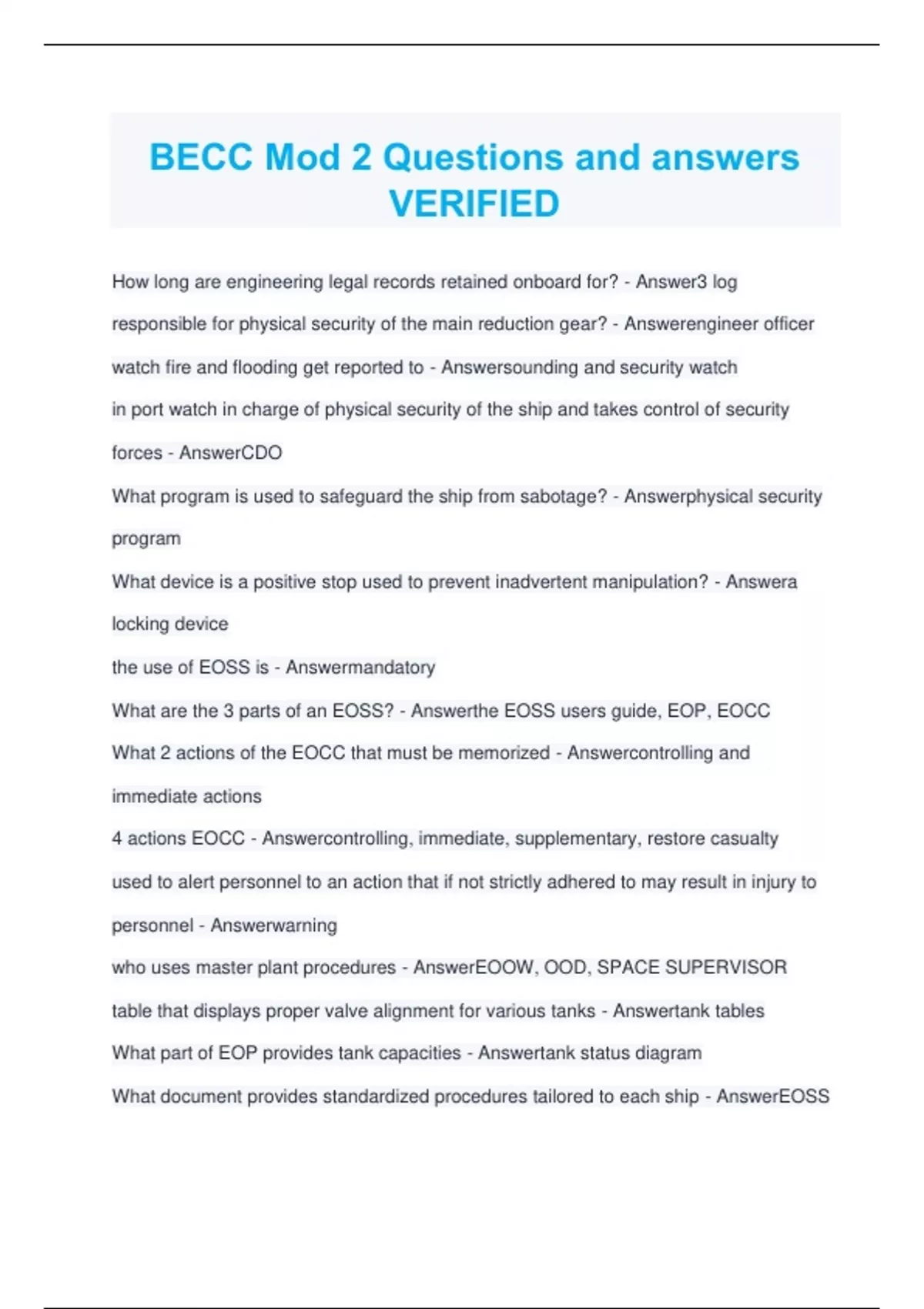 How long are engineering legal records retained onboard for? - Answer3 log responsible for physical security of the main reduction gear? - Answerengineer officer watch fire and flooding get reported to - Answersounding and security watch in port watch in charge of physical security of the ship and takes control of security forces - AnswerCDO What program is used to safeguard the ship from sabotage? - Answerphysical security program What device is a positive stop used to prevent inadvertent manipulation? - Answera locking device the use of EOSS is - Answermandatory What are the 3 parts of an EOSS? - Answerthe EOSS users guide, EOP, EOCC What 2 actions of the EOCC that must be memorized - Answercontrolling and immediate actions 4 actions EOCC - Answercontrolling, immediate, supplementary, restore casualty used to alert personnel to an action that if not strictly adhered to may result in injury to personnel - Answerwarning who uses master plant procedures - AnswerEOOW, OOD, SPACE SUPERVISOR table that displays proper valve alignment for various tanks - Answertank tables What part of EOP provides tank capacities - Answertank status diagram What document provides standardized procedures tailored to each ship - AnswerEOSS