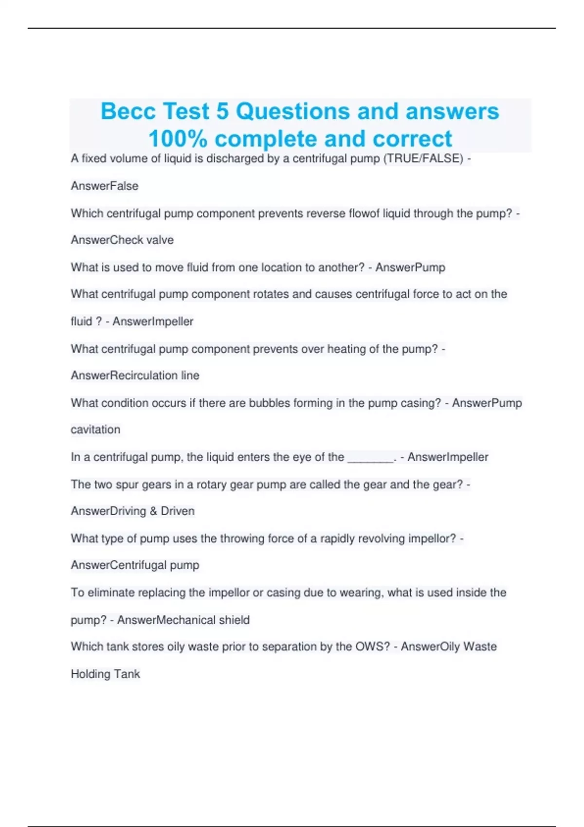 A fixed volume of liquid is discharged by a centrifugal pump (TRUE/FALSE) - AnswerFalse Which centrifugal pump component prevents reverse flowof liquid through the pump? - AnswerCheck valve What is used to move fluid from one location to another? - AnswerPump What centrifugal pump component rotates and causes centrifugal force to act on the fluid ? - AnswerImpeller What centrifugal pump component prevents over heating of the pump? - AnswerRecirculation line What condition occurs if there are bubbles forming in the pump casing? - AnswerPump cavitation In a centrifugal pump, the liquid enters the eye of the _______. - AnswerImpeller The two spur gears in a rotary gear pump are called the gear and the gear? - AnswerDriving & Driven What type of pump uses the throwing force of a rapidly revolving impellor? - AnswerCentrifugal pump To eliminate replacing the impellor or casing due to wearing, what is used inside the pump? - AnswerMechanical shield Which tank stores oily waste prior to separation by the OWS? - AnswerOily Waste Holding Tank What is the allowed limit of oil in the overboard discharge if the ship is within 50 miles of land? - Answer15 PPM (Part Per Million) What is used to remove large particulate matter from oil before it enters the OWS? - AnswerDuplex strainer What tank receives separated oil from the OWS for later discharge? - AnswerWaste oil tank What is used to measure the amount of oil in water that is discharged overboard? - AnswerOil content monitor Heat transfer from physical contact between two fluids is known as? - AnswerConduction Heat transfer through the mixing of fluids is known as? - AnswerConvection Which type of heat exchange is made up of stacked plates? - AnswerPlate type What type of heat exchange Cools steam back into its liquid form? - AnswerCondenser What type of flow does an exchanger have if the liquids enters one side and travels out the same direction? - AnswerParallel What type of exchanger has a tube inside of another tube? - AnswerDouble tube Which exchanger has one or more coils of tubing inside of a shell? - AnswerHelical & Spiral What type of flow is used if the fluids flow at a right angle (90 degrees) to each other? - AnswerCross flow What type of gear has the teeth arranged in a V pattern? - AnswerDouble helical gear What gear can be used tochange the speed and torque without changing the direction? - AnswerInternal spur