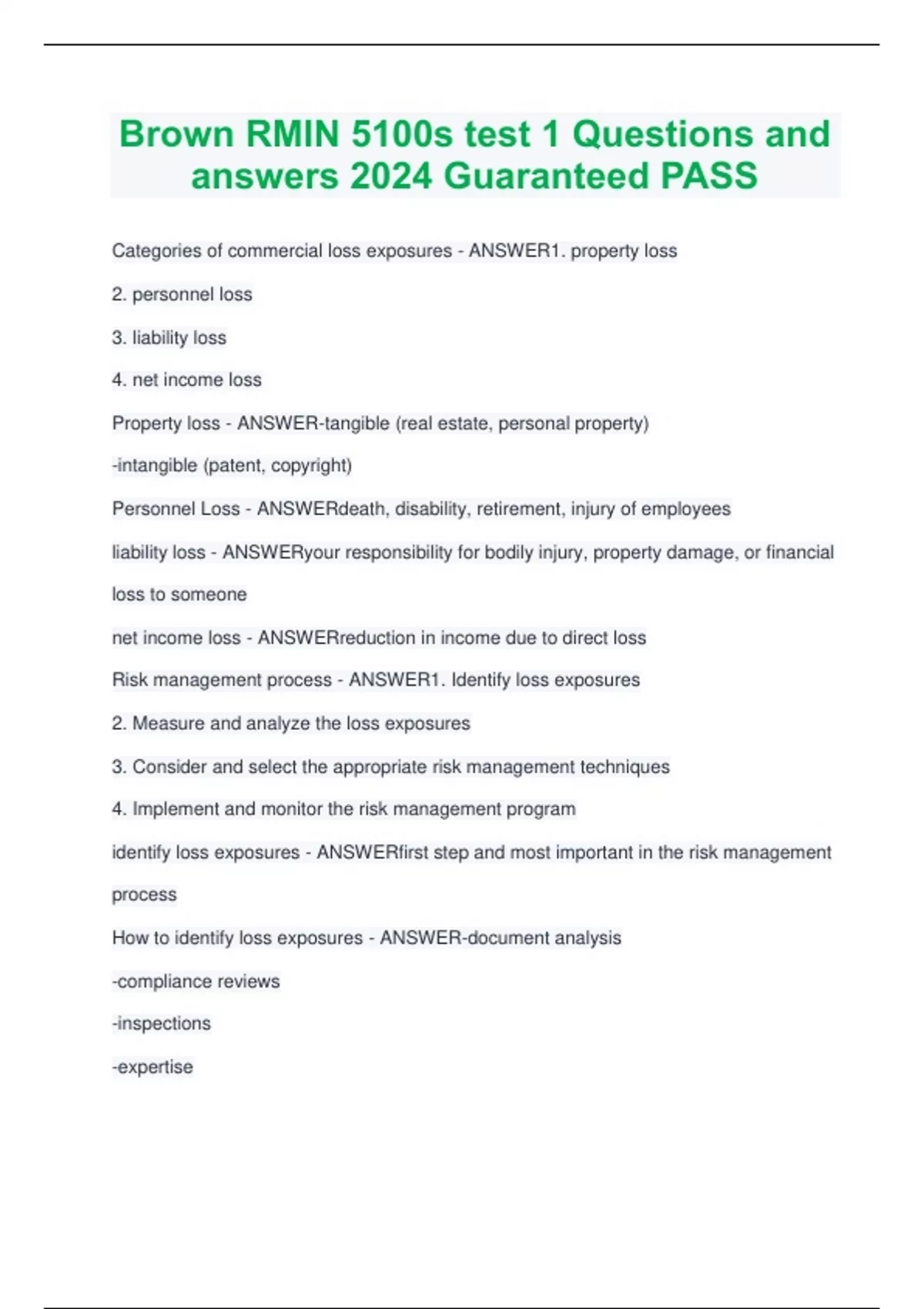 Categories of commercial loss exposures - ANSWER1. property loss 2. personnel loss 3. liability loss 4. net income loss Property loss - ANSWER-tangible (real estate, personal property) -intangible (patent, copyright) Personnel Loss - ANSWERdeath, disability, retirement, injury of employees liability loss - ANSWERyour responsibility for bodily injury, property damage, or financial loss to someone net income loss - ANSWERreduction in income due to direct loss Risk management process - ANSWER1. Identify loss exposures 2. Measure and analyze the loss exposures 3. Consider and select the appropriate risk management techniques 4. Implement and monitor the risk management program identify loss exposures - ANSWERfirst step and most important in the risk management process How to identify loss exposures - ANSWER-document analysis -compliance reviews -inspections -expertise