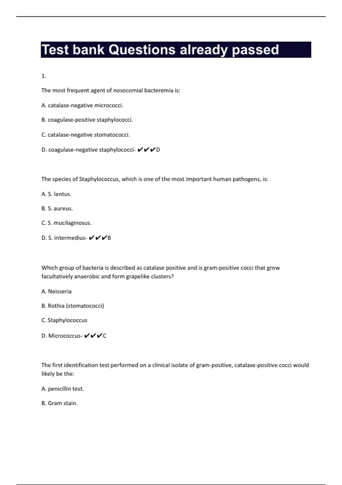 1. The most frequent agent of nosocomial bacteremia is: A. catalase-negative micrococci. B. coagulase-positive staphylococci. C. catalase-negative stomatococci. D. coagulase-negative staphylococci- D The species of Staphylococcus, which is one of the most important human pathogens, is: A. S. lentus. B. S. aureus. C. S. mucilaginosus. D. S. intermedius- B Which group of bacteria is described as catalase positive and is gram-positive cocci that grow facultatively anaerobic and form grapelike clusters? A. Neisseria B. Rothia (stomatococci) C. Staphylococcus D. Micrococcus- C The first identification test performed on a clinical isolate of gram-positive, catalase-positive cocci would likely be the: A. penicillin test. B. Gram stain. C. oxidase test. D. coagulase test- D The slide coagulase test is a rapid screening test for the production of: A. clumping factor. B. free coagulase. C. extracellular coagulase. D. catalase.- A A tube coagulase test was performed on catalase-positive, gram-positive cocci that were beta hemolytic and grew on mannitol salt agar. The tube was checked after overnight incubation and was negative. Which of the following statements explains this discrepancy? A. A tube coagulase should not be performed on a catalase-positive organism. B. A beta-hemolytic colony, which is catalase positive and grows on mannitol salt, is normally coagulase negative. C. The test should have been read in 1 to 4 hours in case any hemolysins are present. D. No discrepancy is present; the results are accurate- C The tube coagulase test: A. detects bound coagulase. B. detects extracellular coagulase. C. is performed on slide coagulase-positive isolates to confirm a positive result. D. requires citrated reagent plasma- B In clinical isolates, the most likely identification of coagulase-positive, catalase-positive, gram-positive cocci that are penicillin resistant would be: A. Staphylococcus aureus. B. Staphylococcus intermedius. C. Stomatococcus luteus. D. Micrococcus aureus- A Which virulent and important human pathogen can also be recovered from the nares, perineum, and other skin sites of healthy people, especially in the hospital setting? A. Micrococcus luteus B. Staphylococcus intermedius C. Staphylococcus aureus D. All Micrococcaceae- C The resident human flora, staphylococcus, which is more likely to cause infections in compromised hosts such as patients with cancer, is: A. S. saprophyticus. B. S. aureus. C. S. epidermidis. D. S. intermedius- C The Staphylococcaceae staphylococcus that is more likely to cause uncomplicated urinary tract infections in nonhospitalized hosts, especially sexually active young women, is: A. S. saprophyticus. B. S. aureus. C. S. epidermidis. D. S. intermedius.- A Isolates of coagulase-negative Staphylococcus from urinary tract infections can be presumptively identified as S. saprophyticuson the basis of its: