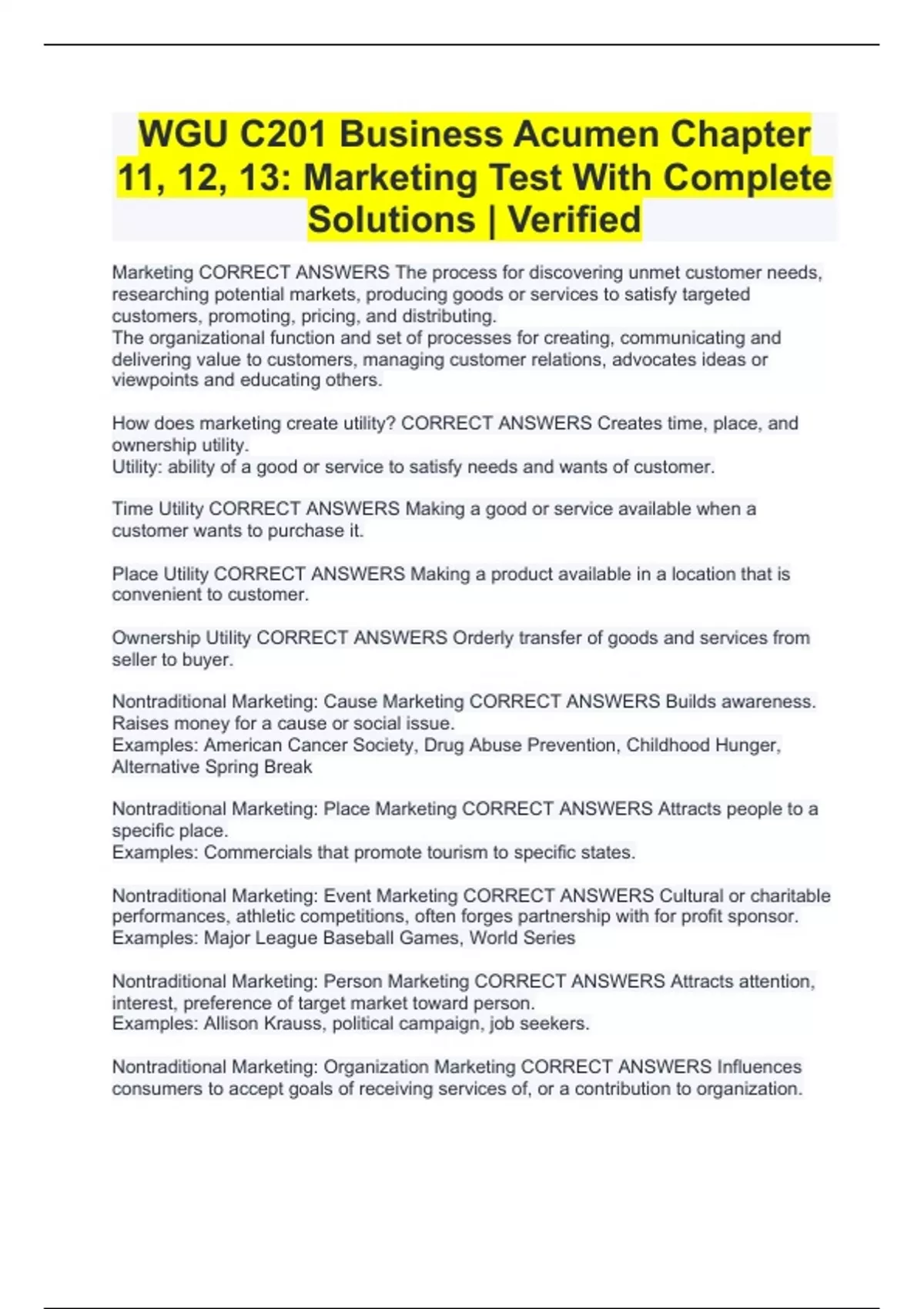 WGU C201 Business Acumen Chapter 11, 12, 13: Marketing Test With Complete Solutions | Verified