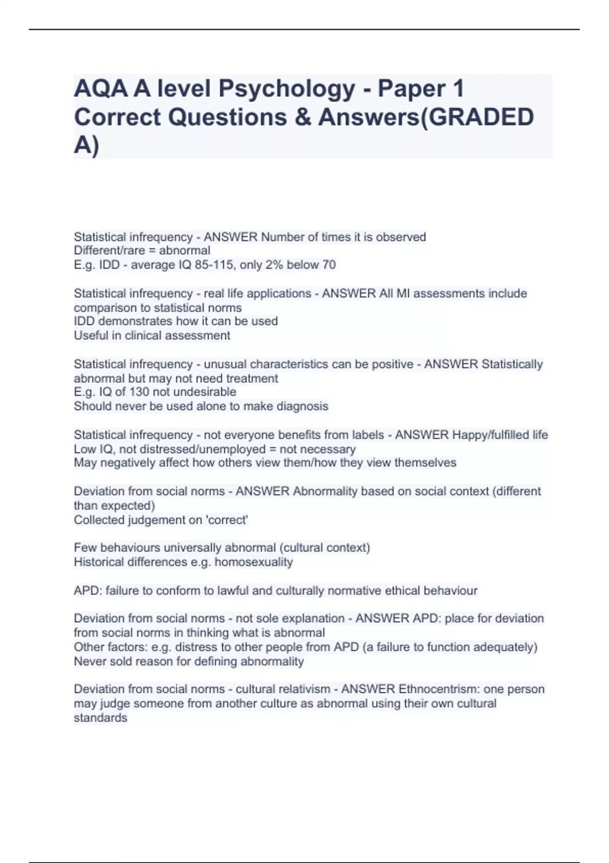 AQA A level Psychology - Paper 1 Correct Questions & Answers(GRADED A)