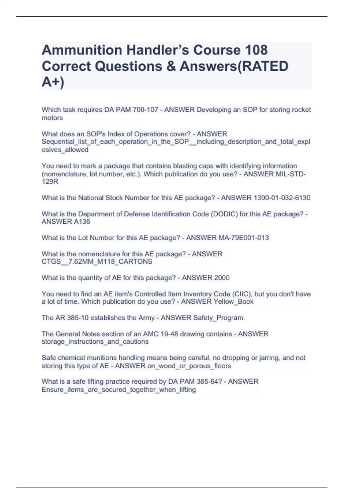 Ammunition Handler’s Course 108 Correct Questions & Answers(RATED A+)Ammunition Handler’s Course 108 Correct Questions & Answers(RATED A+)Ammunition Handler’s Course 108 Correct Questions & Answers(RATED A+)Ammunition Handler’s Course 108 Correct Questions & Answers(RATED A+)Ammunition Handler’s Course 108 Correct Questions & Answers(RATED A+)Ammunition Handler’s Course 108 Correct Questions & Answers(RATED A+)Ammunition Handler’s Course 108 Correct Questions & Answers(RATED A+)Ammunition Handler’s Course 108 Correct Questions & Answers(RATED A+)Ammunition Handler’s Course 108 Correct Questions & Answers(RATED A+)Ammunition Handler’s Course 108 Correct Questions & Answers(RATED A+)Ammunition Handler’s Course 108 Correct Questions & Answers(RATED A+)
