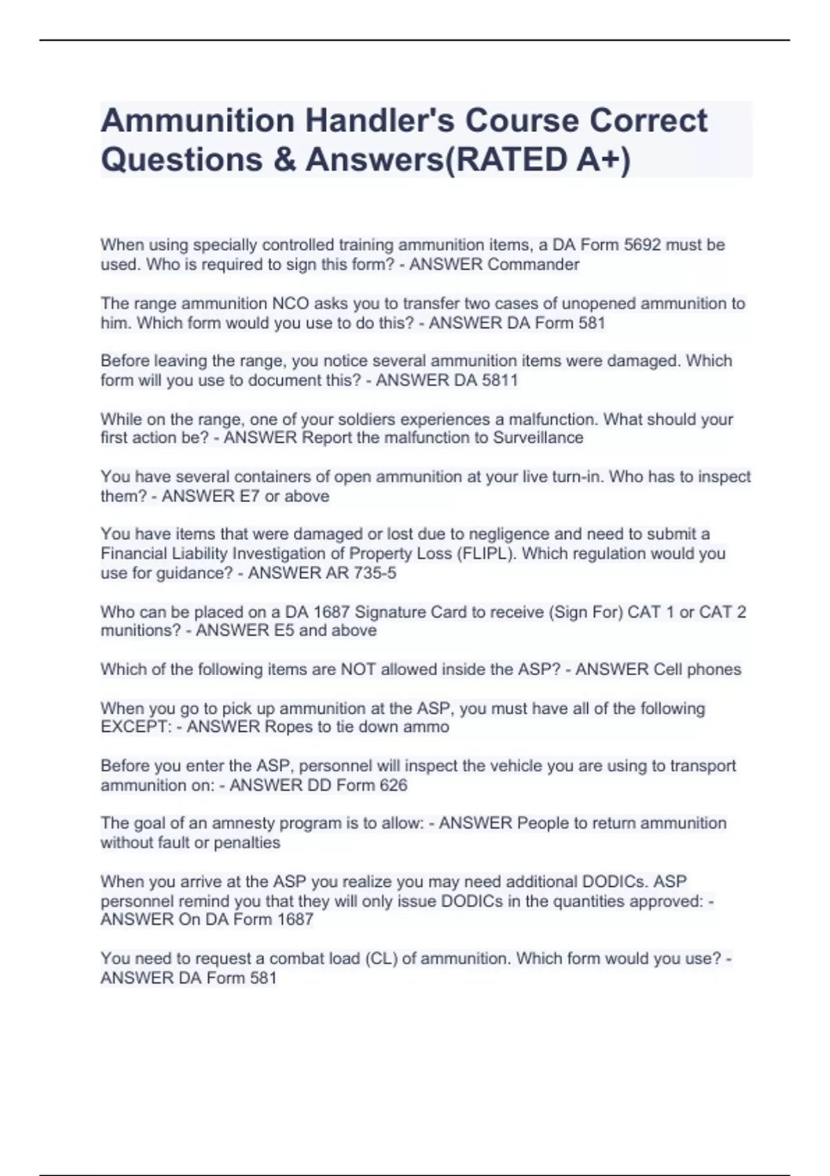 Ammunition Handler's Course Correct Questions & Answers(RATED A+)