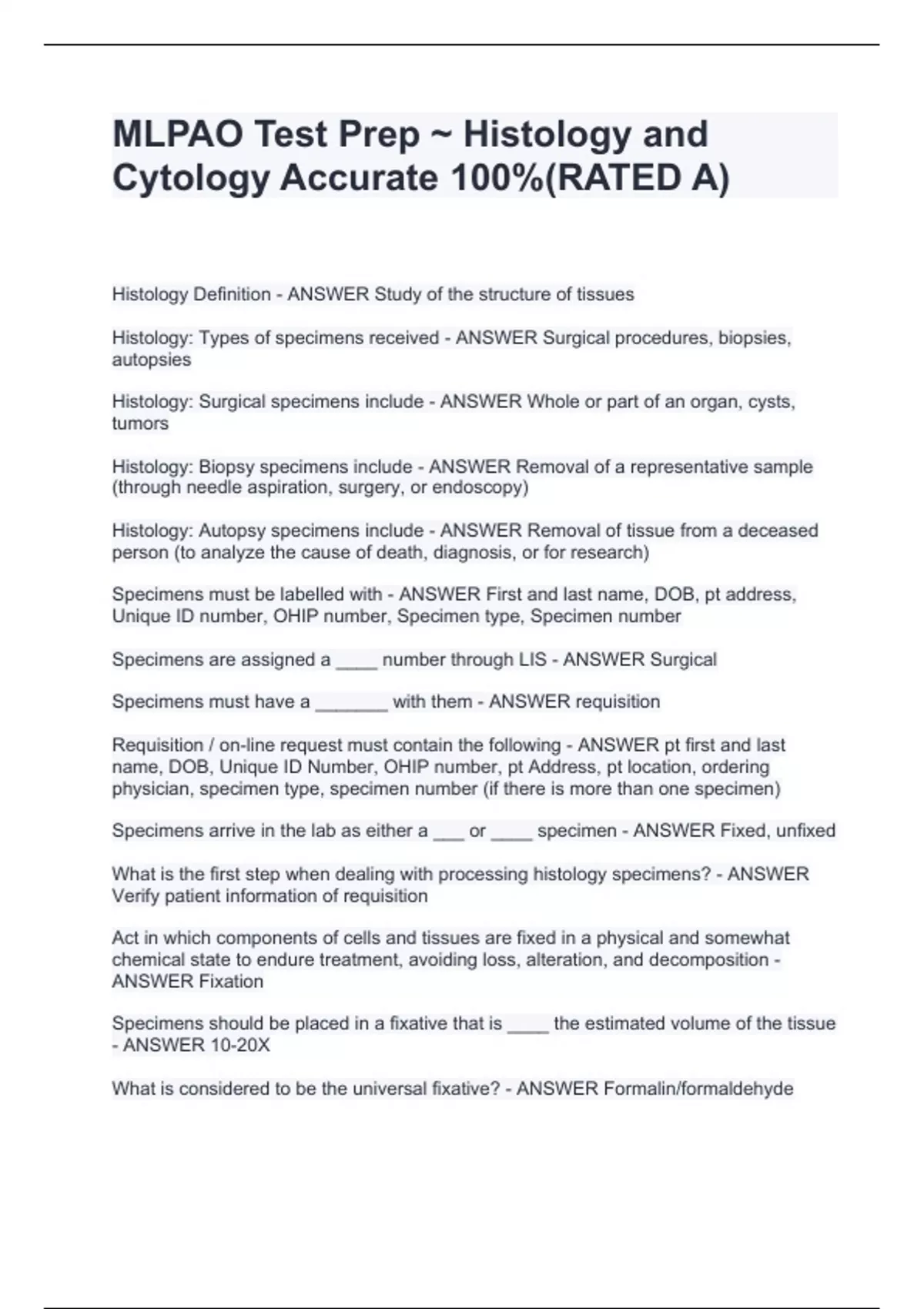 Histology: Surgical specimens include - ANSWER Whole or part of an organ, cysts, tumors