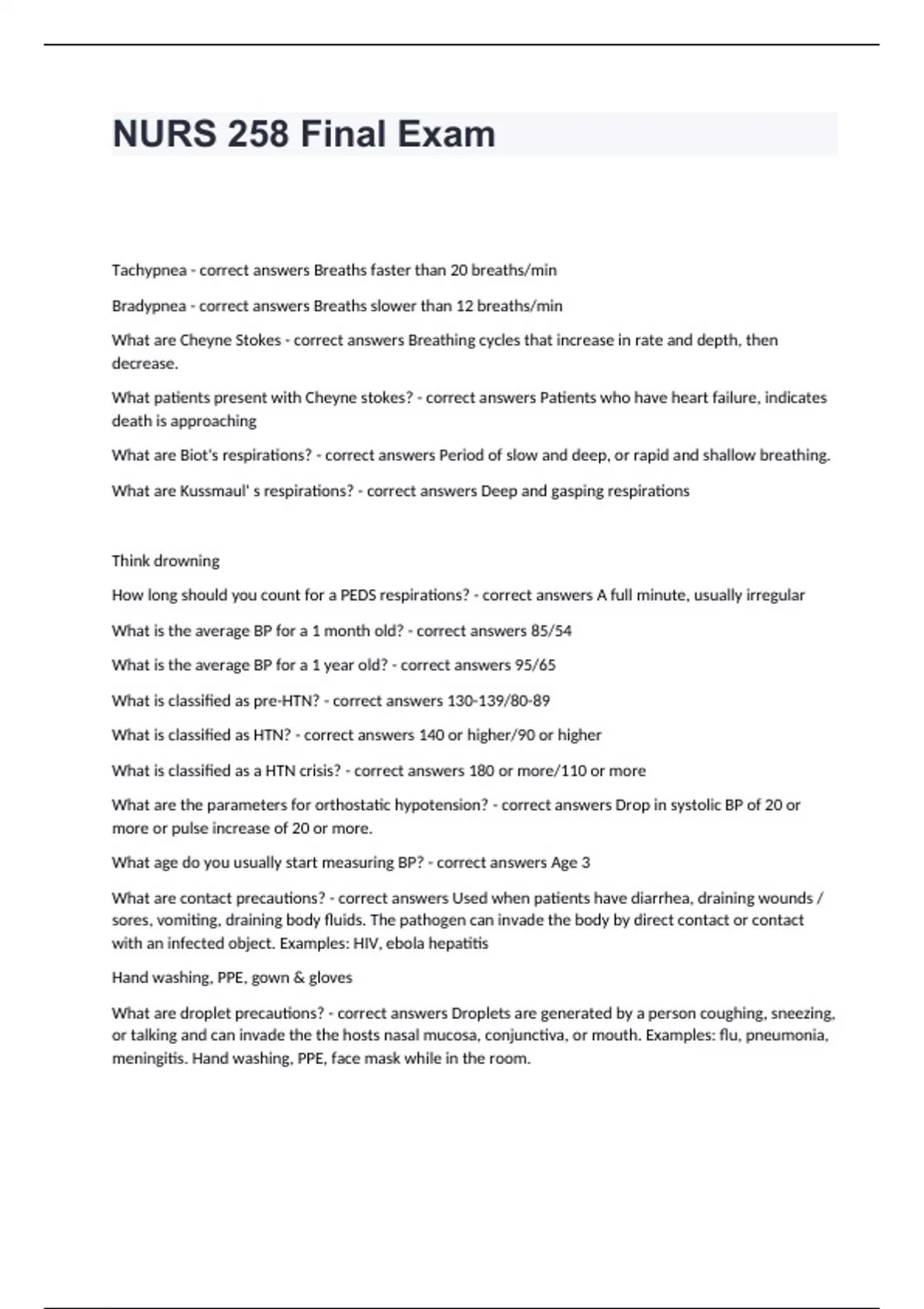 NURS 258 Final Exam Tachypnea - correct answers Breaths faster than 20 breaths/min Bradypnea - correct answers Breaths slower than 12 breaths/min What are Cheyne Stokes - correct answers Breathing cycles that increase in rate and depth, then decrease. What patients present with Cheyne stokes? - correct answers Patients who have heart failure, indicates death is approaching What are Biot's respirations? - correct answers Period of slow and deep, or rapid and shallow breathing. What are Kussmaul' s respirations? - correct answers Deep and gasping respirations Think drowning How long should you count for a PEDS respirations? - correct answers A full minute, usually irregular What is the average BP for a 1 month old? - correct answers 85/54 What is the average BP for a 1 year old? - correct answers 95/65 What is classified as pre-HTN? - correct answers 130-139/80-89 What is classified as HTN? - correct answers 140 or higher/90 or higher What is classified as a HTN crisis? - correct answers 180 or more/110 or more What are the parameters for orthostatic hypotension? - correct answers Drop in systolic BP of 20 or more or pulse increase of 20 or more. What age do you usually start measuring BP? - correct answers Age 3 What are contact precautions? - correct answers Used when patients have diarrhea, draining wounds / sores, vomiting, draining body fluids. The pathogen can invade the body by direct contact or contact with an infected object. Examples: HIV, ebola hepatitis Hand washing, PPE, gown & gloves What are droplet precautions? - correct answers Droplets are generated by a person coughing, sneezing, or talking and can invade the the hosts nasal mucosa, conjunctiva, or mouth. Examples: flu, pneumonia, meningitis. Hand washing, PPE, face mask while in the room.