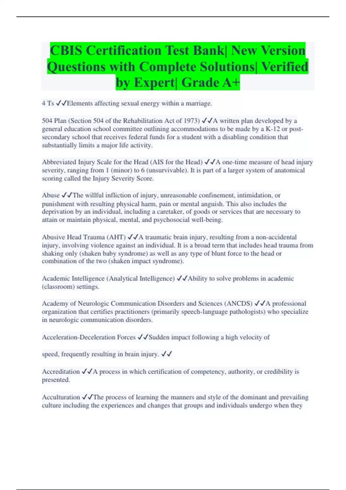 CBIS Certification Test Bank| New Version Questions with Complete Solutions| Verified by Expert| Grade A+ 4 Ts Elements affecting sexual energy within a marriage. 504 Plan (Section 504 of the Rehabilitation Act of 1973) A written plan developed by a general education school committee outlining accommodations to be made by a K-12 or postsecondary school that receives federal funds for a student with a disabling condition that substantially limits a major life activity. Abbreviated Injury Scale for the Head (AIS for the Head) A one-time measure of head injury severity, ranging from 1 (minor) to 6 (unsurvivable). It is part of a larger system of anatomical scoring called the Injury Severity Score. Abuse The willful infliction of injury, unreasonable confinement, intimidation, or punishment with resulting physical harm, pain or mental anguish. This also includes the deprivation by an individual, including a caretaker, of goods or services that are necessary to attain or maintain physical, mental, and psychosocial well-being. Abusive Head Trauma (AHT) A traumatic brain injury, resulting from a non-accidental injury, involving violence against an individual. It is a broad term that includes head trauma from shaking only (shaken baby syndrome) as well as any type of blunt force to the head or combination of the two (shaken impact syndrome). Academic Intelligence (Analytical Intelligence) Ability to solve problems in academic (classroom) settings. Academy of Neurologic Communication Disorders and Sciences (ANCDS) A professional organization that certifies practitioners (primarily speech-language pathologists) who specialize in neurologic communication disorders. Acceleration-Deceleration Forces Sudden impact following a high velocity of speed, frequently resulting in brain injury. Accreditation A process in which certification of competency, authority, or credibility is presented. Acculturation The process of learning the manners and style of the dominant and prevailing culture including the experiences and changes that groups and individuals undergo when they