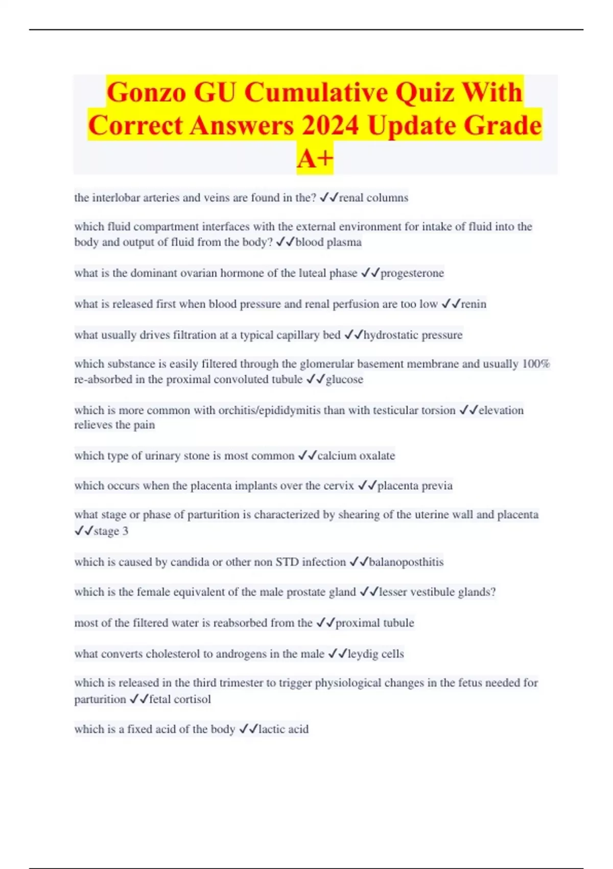 Gonzo GU Cumulative Quiz With Correct Answers 2024 Update Grade A+ the interlobar arteries and veins are found in the? renal columns which fluid compartment interfaces with the external environment for intake of fluid into the body and output of fluid from the body? blood plasma what is the dominant ovarian hormone of the luteal phase progesterone what is released first when blood pressure and renal perfusion are too low renin what usually drives filtration at a typical capillary bed hydrostatic pressure which substance is easily filtered through the glomerular basement membrane and usually 100% re-absorbed in the proximal convoluted tubule glucose which is more common with orchitis/epididymitis than with testicular torsion elevation relieves the pain which type of urinary stone is most common calcium oxalate which occurs when the placenta implants over the cervix placenta previa what stage or phase of parturition is characterized by shearing of the uterine wall and placenta stage 3 which is caused by candida or other non STD infection balanoposthitis which is the female equivalent of the male prostate gland lesser vestibule glands? most of the filtered water is reabsorbed from the proximal tubule what converts cholesterol to androgens in the male leydig cell