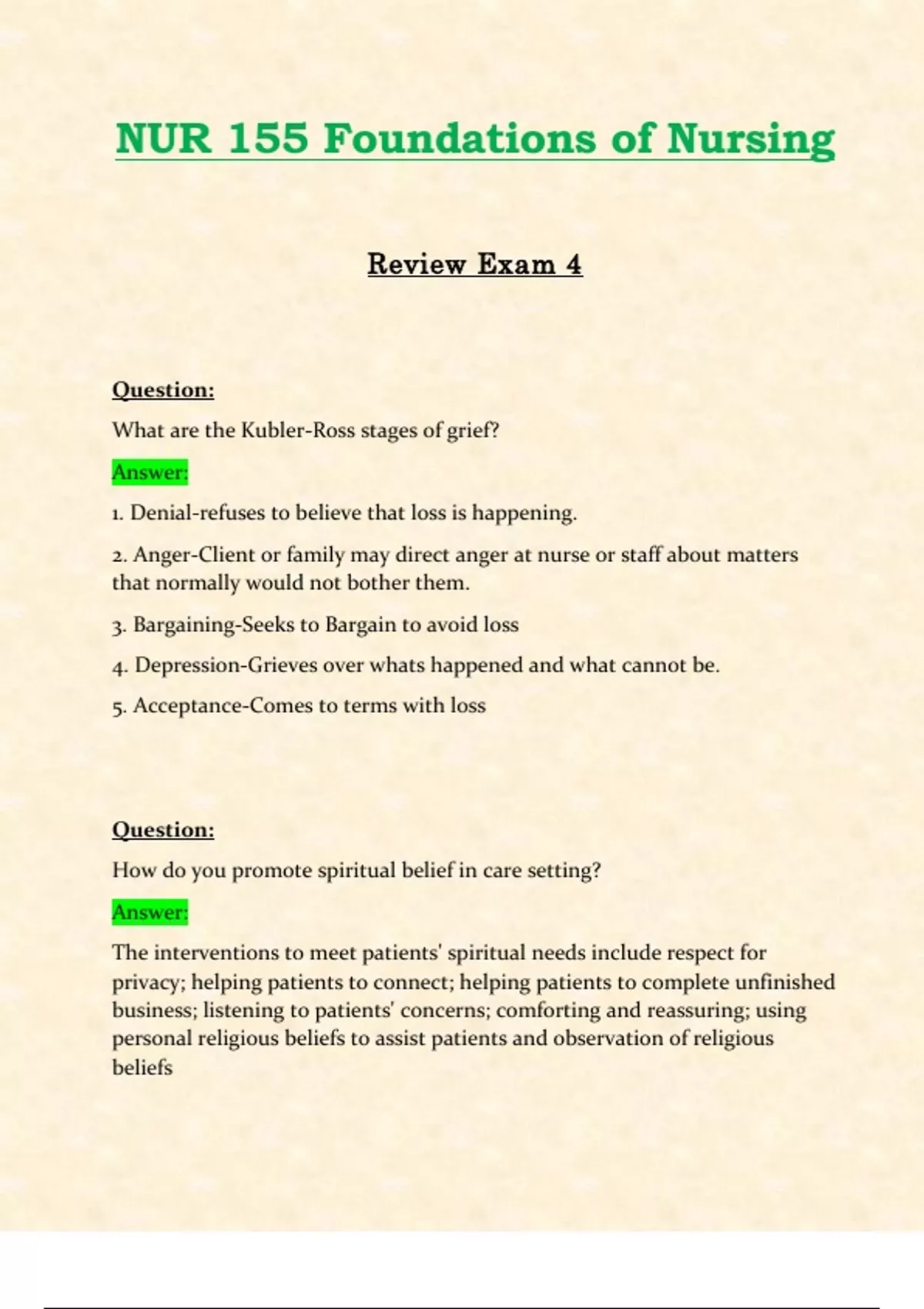 NUR 155 Foundations of Nursing - Galen College of Nursing Review Exam 4 Question: What are the Kubler-Ross stages of grief? Answer: 1. Denial-refuses to believe that loss is happening. 2. Anger-Client or family may direct anger at nurse or staff about matters that normally would not bother them. 3. Bargaining-Seeks to Bargain to avoid loss 4. Depression-Grieves over whats happened and what cannot be. 5. Acceptance-Comes to terms with loss Question: How do you promote spiritual belief in care setting? Answer: The interventions to meet patients' spiritual needs include respect for privacy; helping patients to connect; helping patients to complete unfinished business; listening to patients' concerns; comforting and reassuring; using personal religious beliefs to assist patients and observation of religious beliefs Question: What is palliative care? Answer: Includes, prevention, early identification, comprehensive assessment, and management of physical issues, including pain and other distressing symptoms, psychological distress, spiritual distress, and social needs. Whenever possible, these interventions must be evidence based. Care of the Incurable: Pain Clinic/ Pain Relief Service Care of the Chronically Ill: Care of Cancer (Oncology) Care of the Elderly (Geriatrics): General practice (Family Medicine)